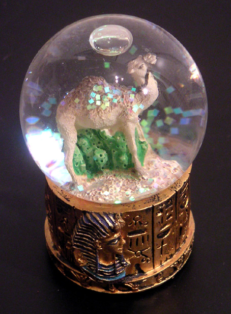 égypte – achetée lors d’un séjour en septembre 2005. il fallait absolument que je m’en rapporte une de là-bas. ça me fait rire, un dromadaire sous la neige (fût-elle de paillettes). quand on sait que le soleil est si agressif (45° à l’ombre… et il n’y a pas d’ombre) que l’on se sent littéralement « grignoté » par les rayons. sphère, petit format: hauteur 6,6 cm, diamètre du socle 4,4 cm.