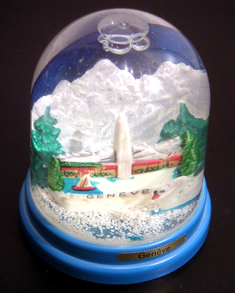 genève – ben oui, il m’en fallait quand même une :)… tout y est: les montagnes enneigées, le lac, le jet d’eau, le voilier, et même le cygne au premier plan. ils auraient pu faire un effort et caser l’horloge fleurie, la cathédrale et le mur des réformateurs, quand même… cloche, grand format: hauteur 9,2 cm, socle diamètre 8,2 cm.