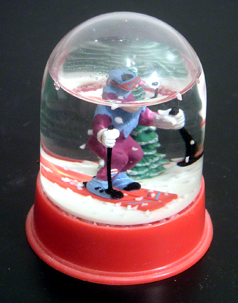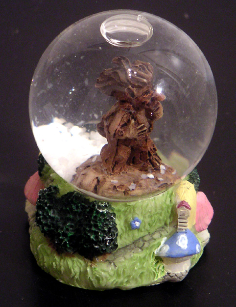 lutin – celle-ci a dû m’être offerte car, j’ai presque honte de le dire, je ne me souviens plus du tout où ni quand je l’ai acquise… en plus, le sujet est assez flou. on dirait un lutin ou une sorte d’écureuil ou encore un morceau de bois personnifié. le socle, orné de champignons et de motifs sylvestres, est assez frais, pour ne pas dire enfantin… sphère, petit format: hauteur 6,6 cm, diamètre du socle 4,4 cm.