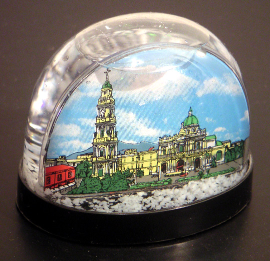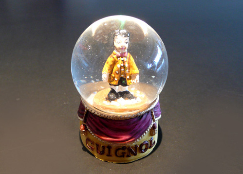lyon guignol – achetée à la fin du picor’trip d’août 2008. guignol fêtait son bicentenaire cette année-là. ça méritait bien une petite boule, non? d’autant que, fait rarissime, on le voit ici en pied. des allures de collector, ça… sphère, petit format: hauteur 6,6 cm, socle 4,1 cm.