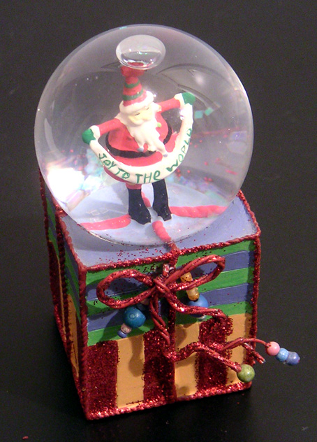 père noël – offerte. encore une boule de circonstance, à ceci près que le père noël arbore cette fois un message universel: « joy to the world ». chou, non? sphère, petit format: hauteur 8,5 cm, socle 3,7×3,7 cm.