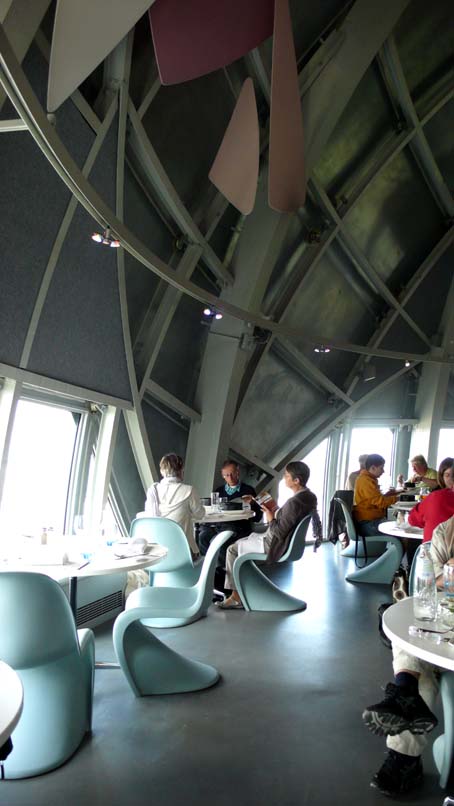 la boule la plus haute renferme un restaurant meublé notamment de chaises panton, où nous avons déjeuné en admirant la vue. ça valait le coup de faire plus d’une heure de queue…