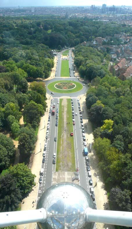 le boulevard du centenaire (vers le nord de la capitale), depuis le restaurant, avec vue sur le palais des expositions, datant de 1958. à gauche de l’image, hors cadre, se trouve le tristement célèbre stade du heysel.