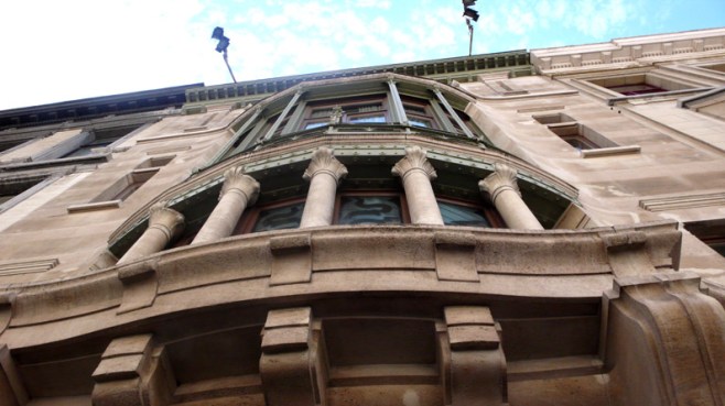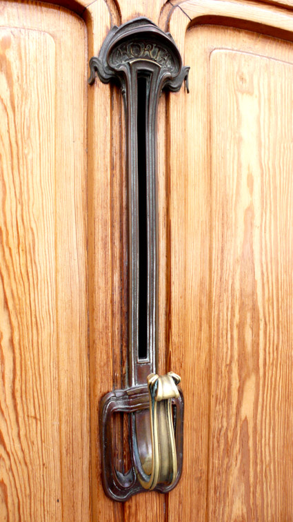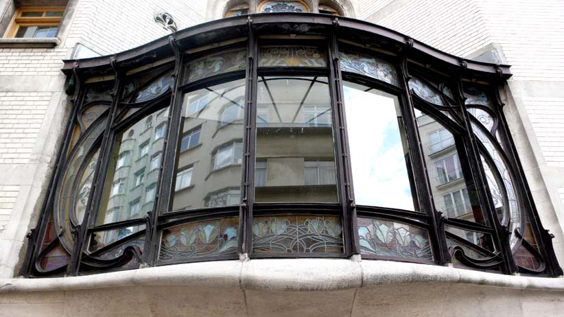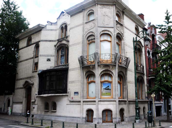 hôtel tassel (1892-93), autre exemple de l’architecture bruxelloise de victor horta. selon le commentaire figurant à gauche de l’entrée, le bow-window reflète l’architecture intérieure complexe du bâtiment.