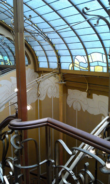 musée horta (1897-1901), escalier. la maison comporte trois cages d’escalier, deux étant situées dans l’habitation – l’une utilisée par les maîtres, l’autre par les domestiques -, la troisième servant au bureau d’architecture. les pièces s’ouvrent sur la cage d’escalier principale coiffée d’un lanterneau vitré. horta multiplie les perspectives et favorise la circulation de la lumière. il allège les structures portantes grâce à l’usage de poutrelles métalliques apparentes. inutile de préciser que ces photos intérieures ont été prises au téléphone portable dans la plus grande discrétion et dans la plus parfaite illégalité.