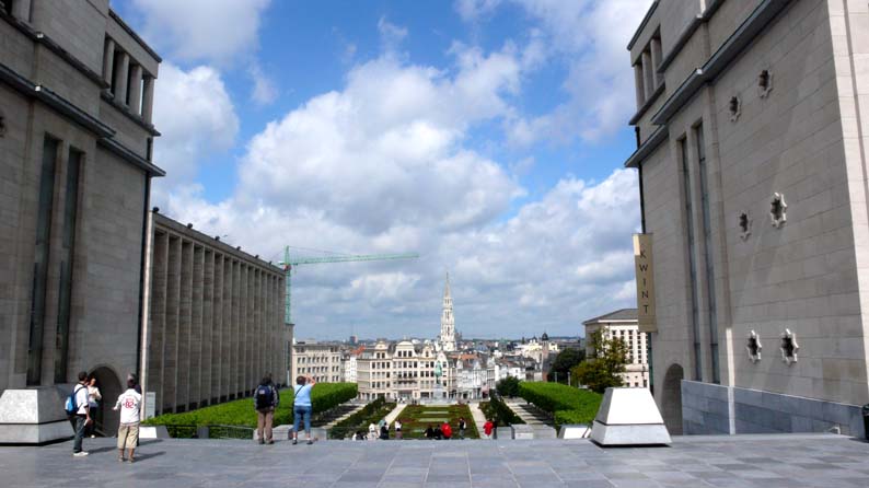 vue (étroite) de bruxelles depuis le mont des arts durant l’une des rares percées du soleil, avec à gauche, ce gigantesque bâtiment art déco façon trocadéro parisien qui accueille la bibliothèque nationale (aussi le musée du livre) et, encore plus à gauche (hors cadre), le musée des beaux-arts, qui abrite, entre autres, le musée magritte.