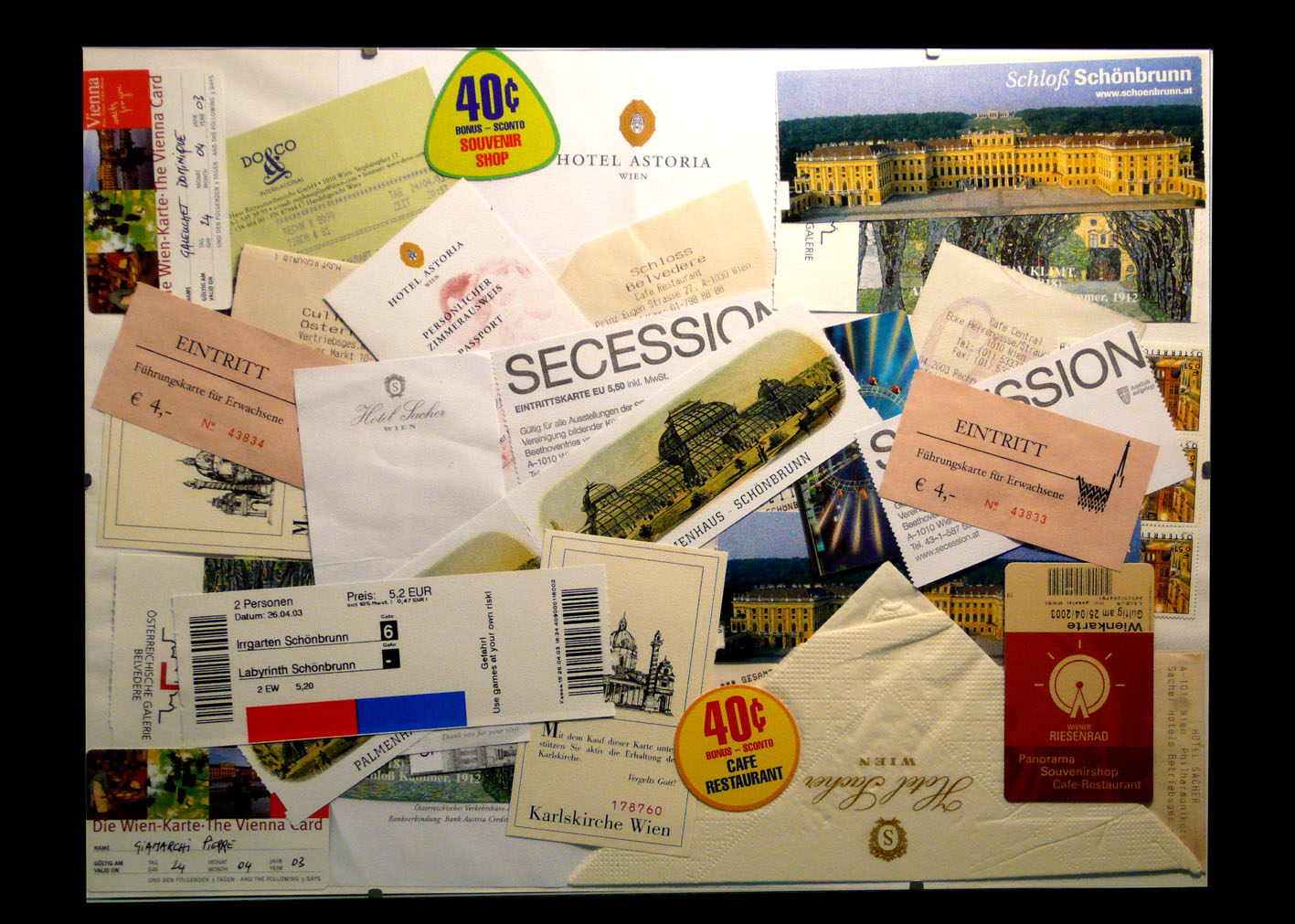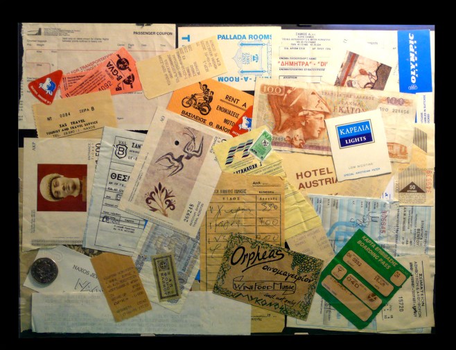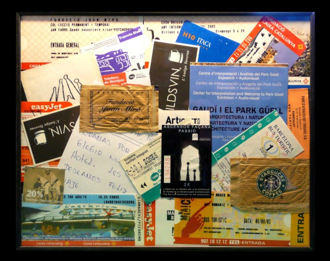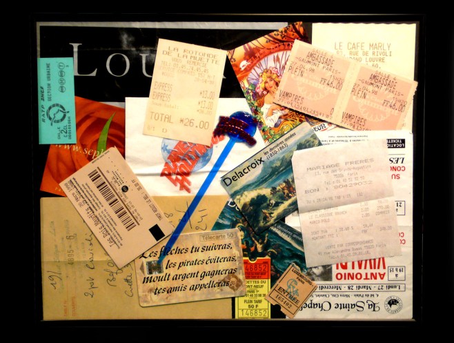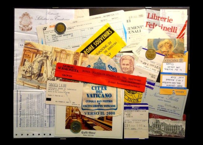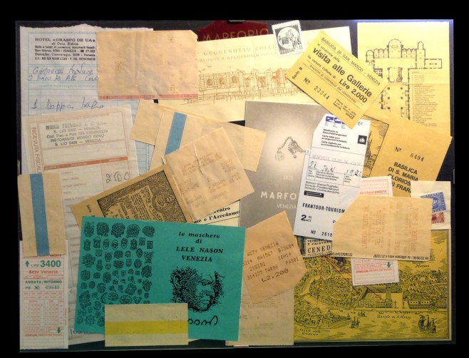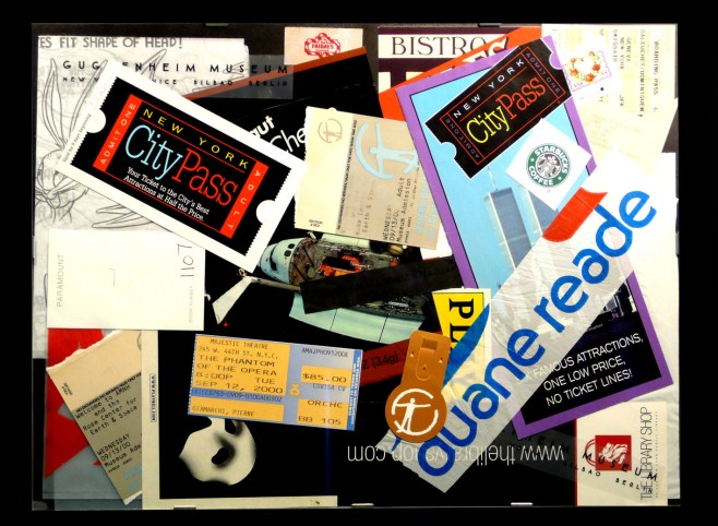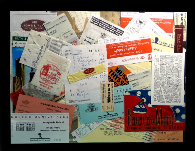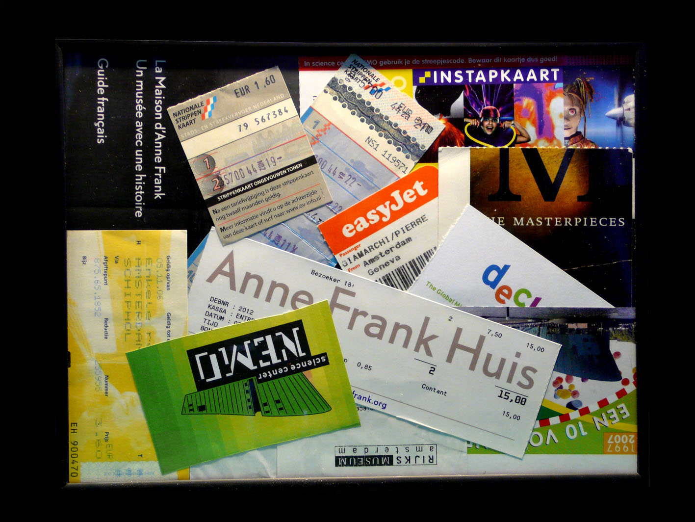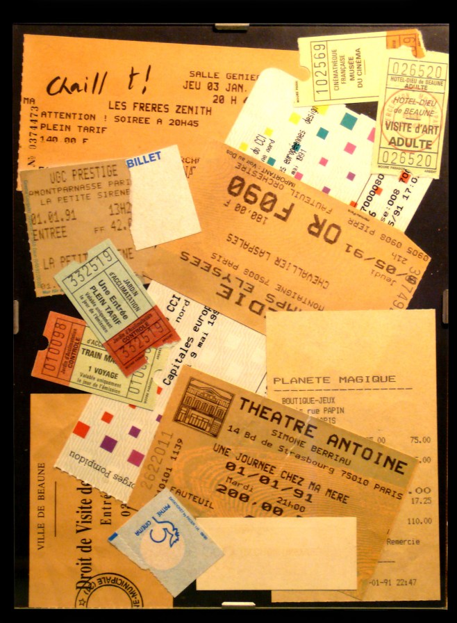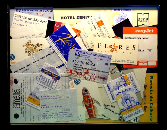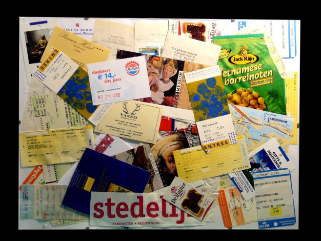 le principe est simple: depuis 1988, quand je pars en voyage, week-end ou vacances (il m’en manque car je ne l’ai pas fait systématiquement), je garde tout ce qui me tombe sous la main – billets d’avion, reçus d’achats, tickets (bus, tram, funiculaire, métro, etc.), billets d’entrée (cinéma, théâtre, musées, aquarium, etc.), sachets de sucre, sacs divers, étiquettes, paquets de bonbons, cartes de visite, récépissés de location de voiture, clés électroniques de chambres d’hôtel, cartes géographiques et plans de ville, billets de banque, pièces de monnaie, etc., BREF, tout ce que j’ai fait et visité, bien sûr, et qui a fait la richesse de la découverte.