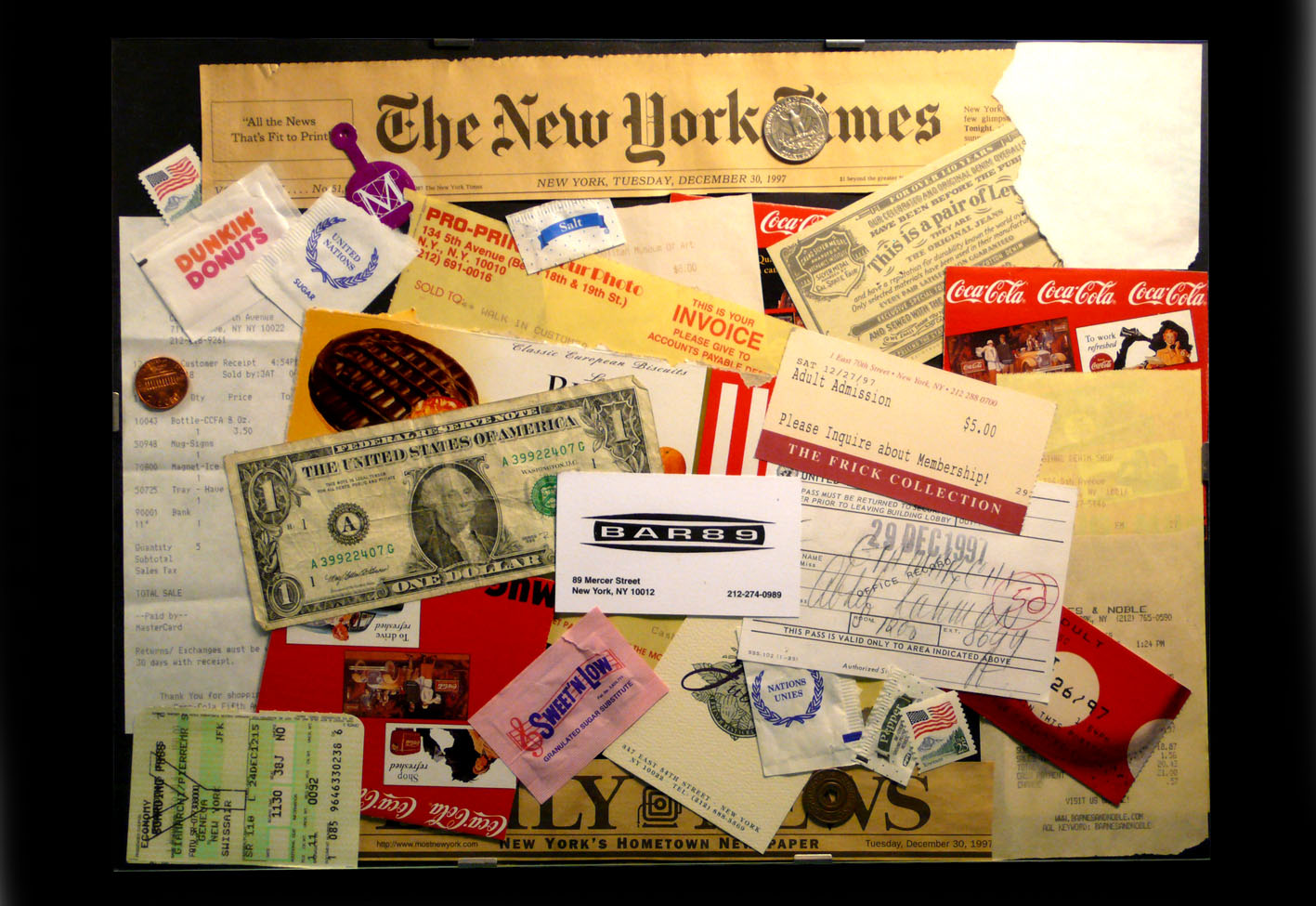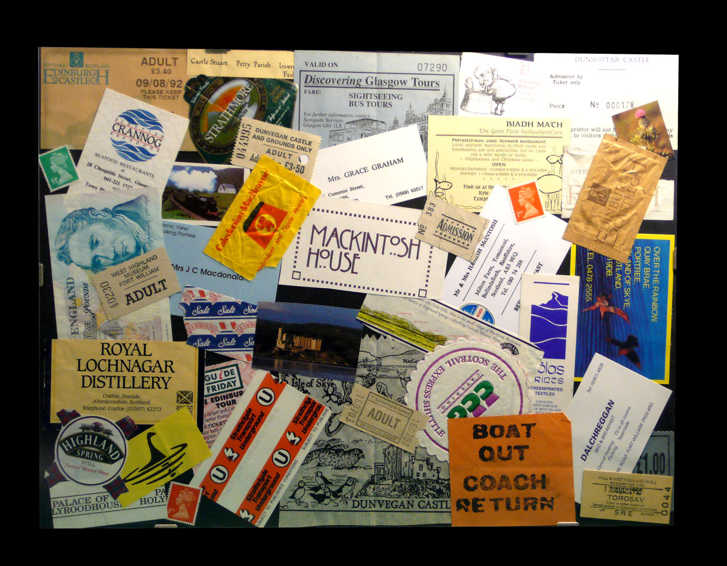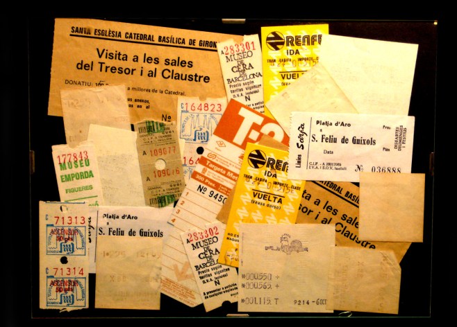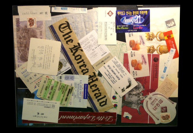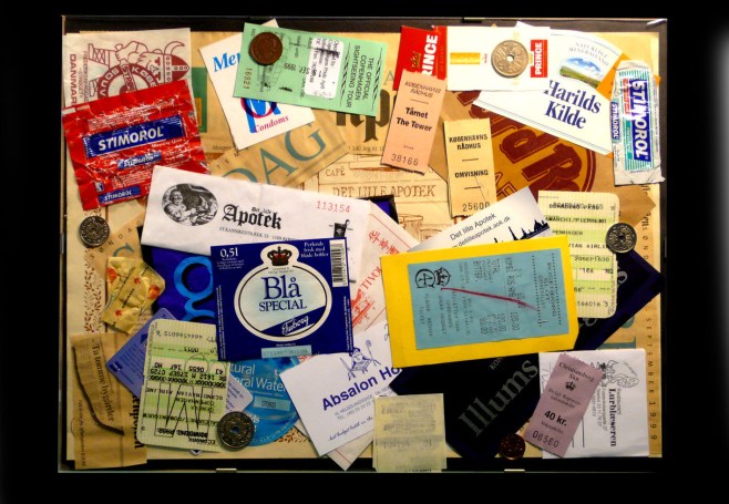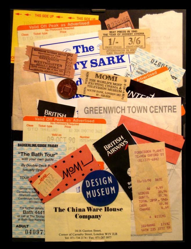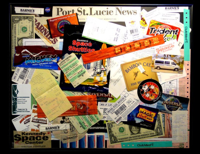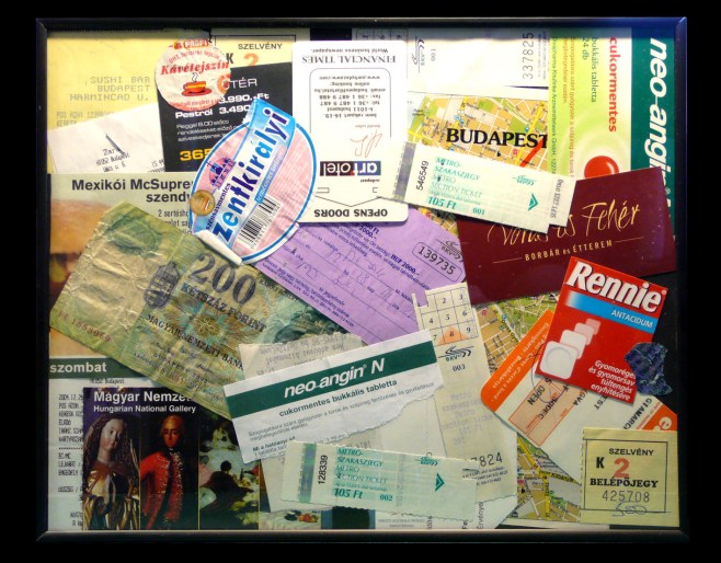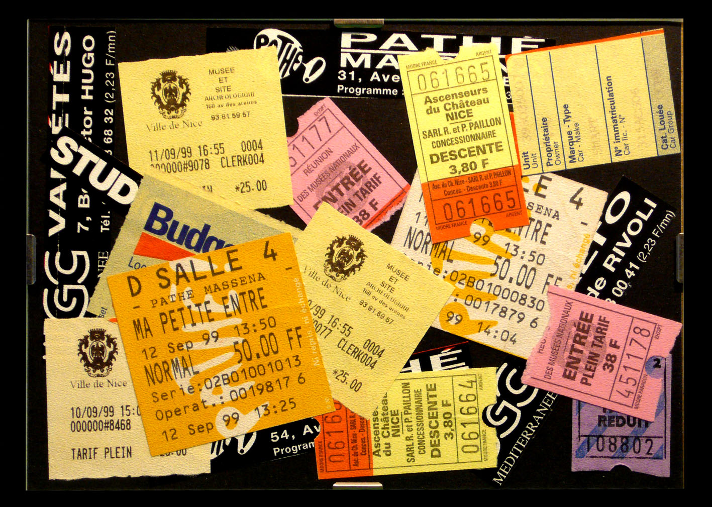 le principe est simple: depuis 1988, quand je pars en voyage, week-end ou vacances (il m’en manque car je ne l’ai pas fait systématiquement), je garde tout ce qui me tombe sous la main – billets d’avion, reçus d’achats, tickets (bus, tram, funiculaire, métro, etc.), billets d’entrée (cinéma, théâtre, musées, aquarium, etc.), sachets de sucre, sacs divers, étiquettes, paquets de bonbons, cartes de visite, récépissés de location de voiture, clés électroniques de chambres d’hôtel, cartes géographiques et plans de ville, billets de banque, pièces de monnaie, etc., BREF, tout ce que j’ai fait et visité, bien sûr, et qui a fait la richesse de la découverte.