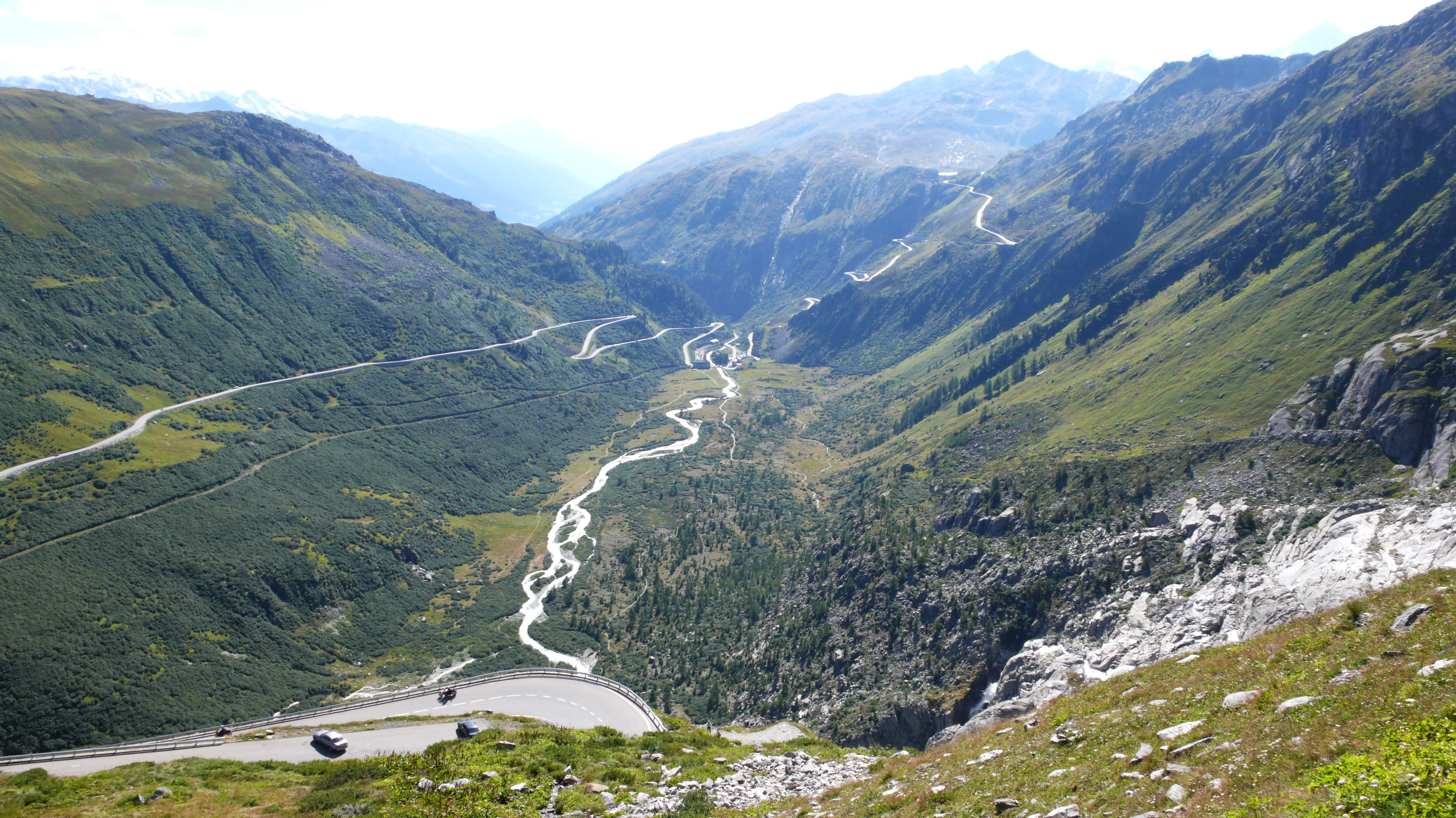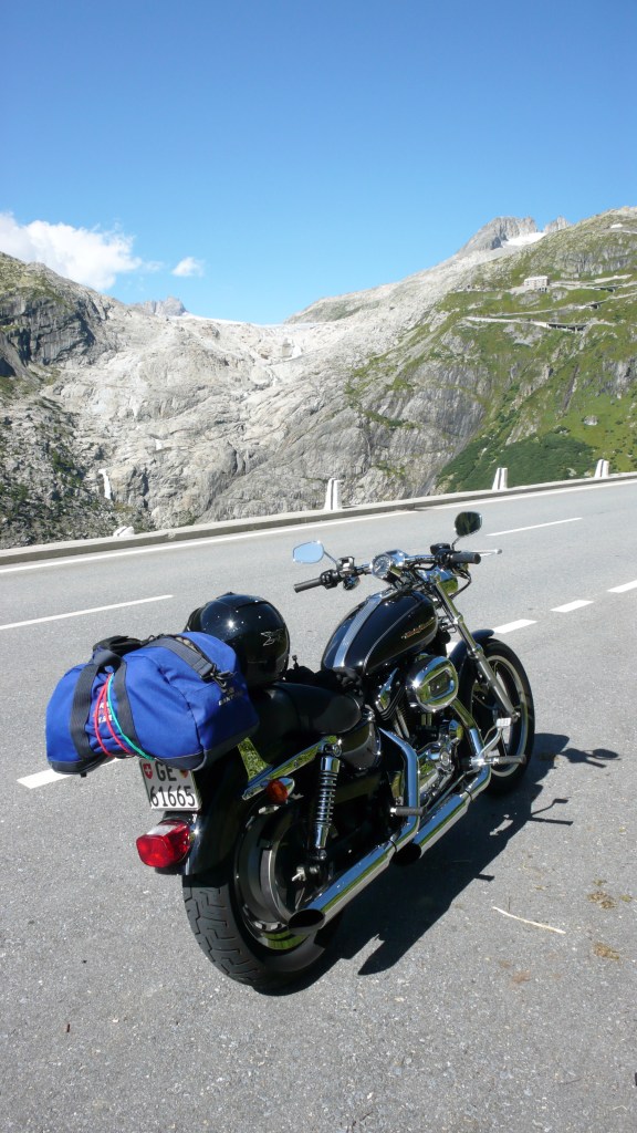 col de la furka. vue splendide et rendez-vous des motards (peu de harleyistes, mais quand même…). la furka culmine à 2400 mètres d’altitude et jouxte le glacier du rhône. le col était une sorte de défi pour moi qui n’avait jamais vraiment affronté de routes de ce type.