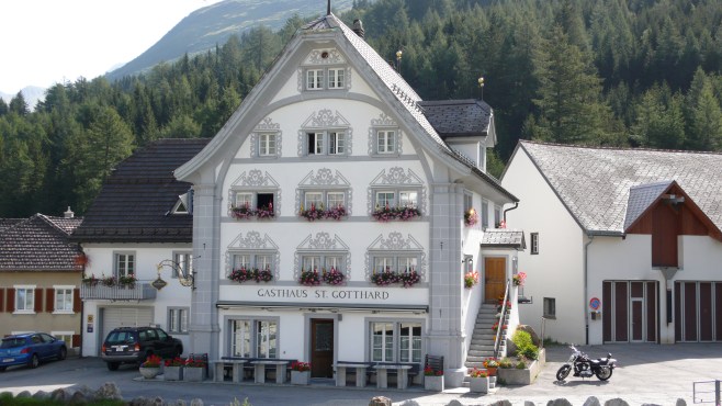 gästhaus st. gotthard. première nuit dans ce petit hôtel très typique et chargé d’histoire fondé en 1722 dans la charmante petite bourgade d’hospental, après le col de la furka. situé à quelques mètres de la route mais très silencieux, l’hôtel constitue une halte idéale pour qui apprécie les wc sur le palier, les salles de restaurant basses de plafond (à caissons) et l’absence de téléviseur ;O)… devinette, une harley-davidson se cache sur cette photo, saurez-vous la trouver?