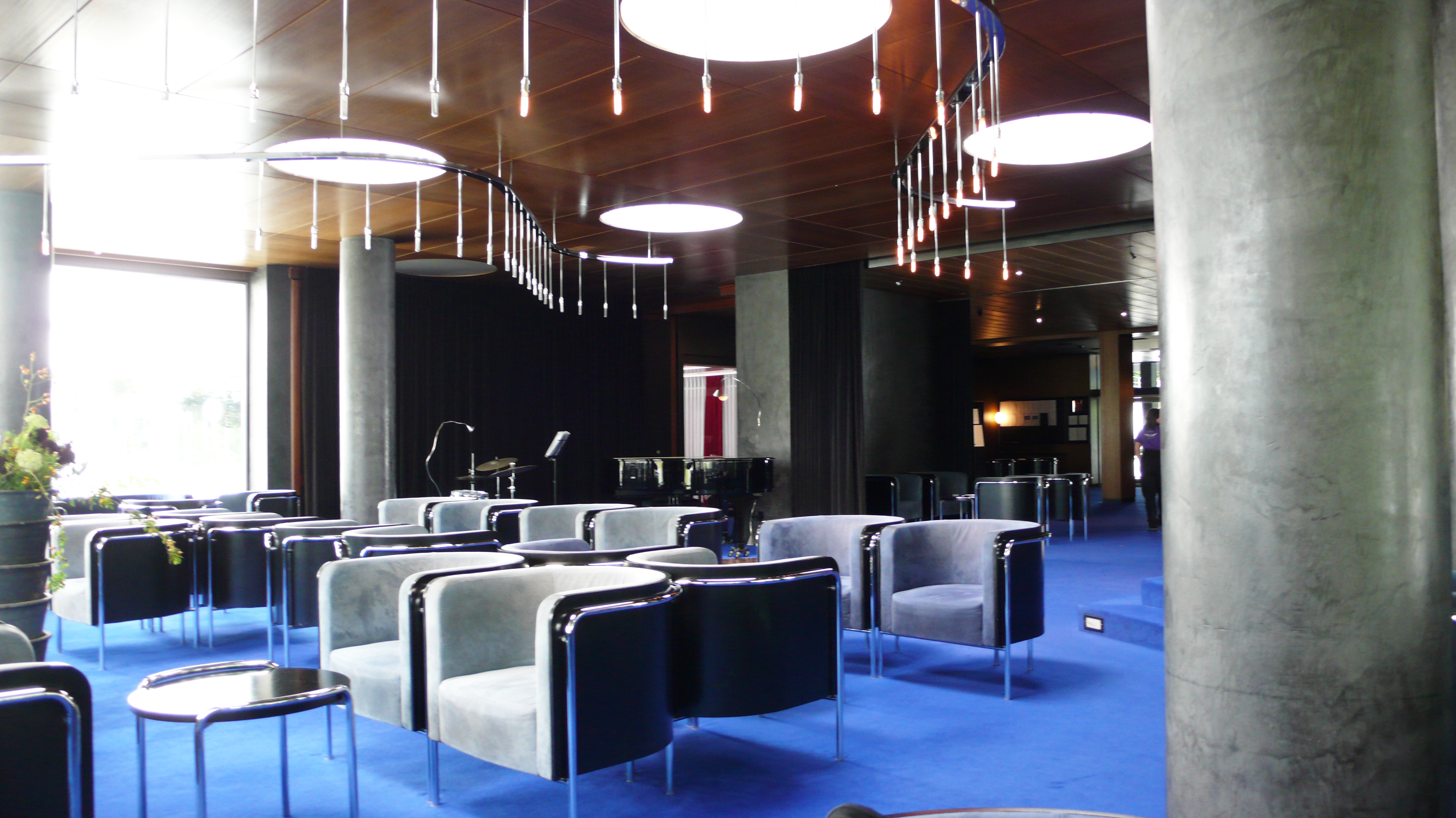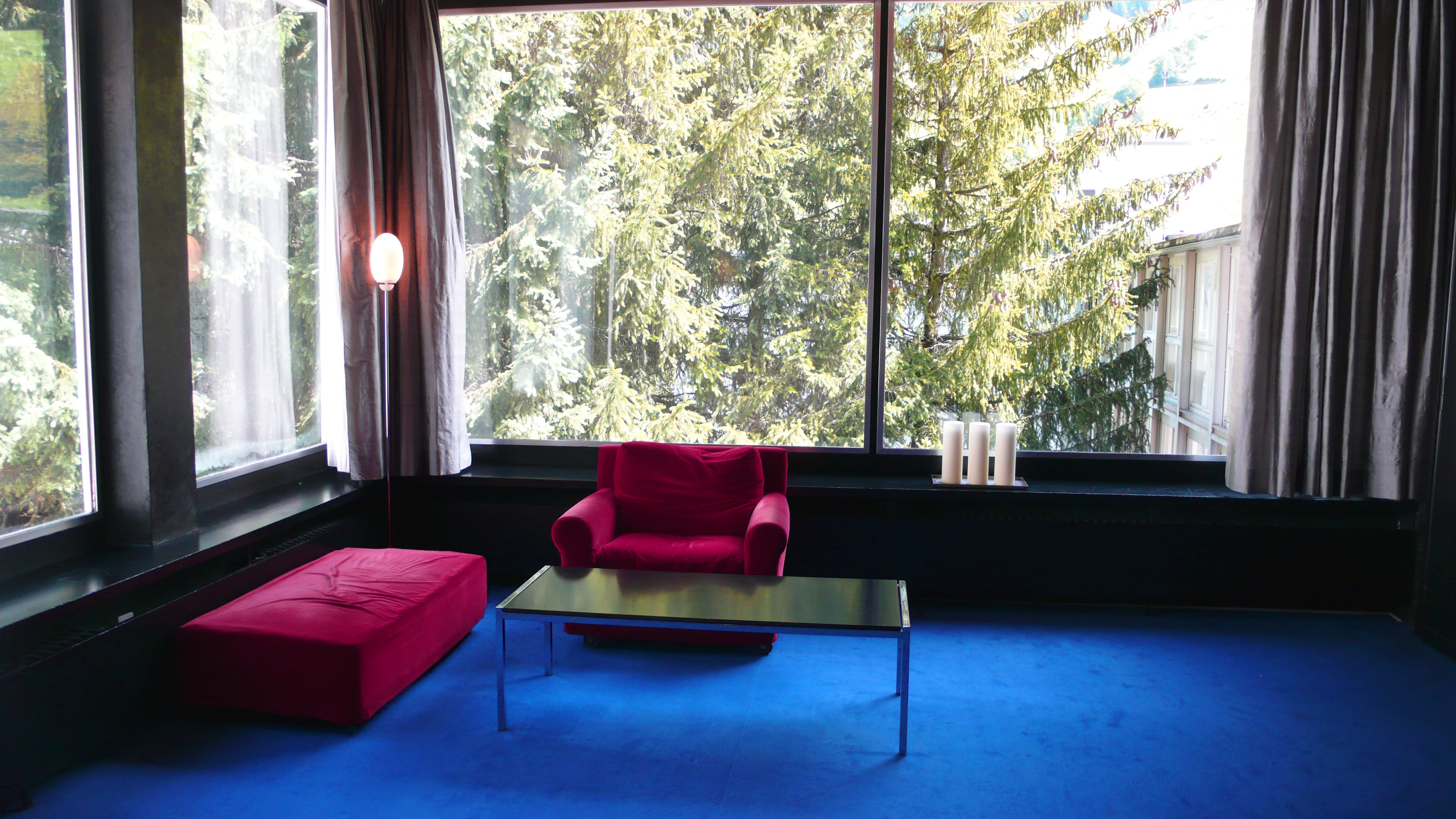 hotel therme – le bar. arrivés à l’hôtel, nous sommes accueillis par un lobby et un bar à l’ambiance contemporaine. l’hôtel comprend deux bâtiments: le premier, construit dans les années 60, et la ‘selva house’ qui comprend: les chambres selva, rappelant des cabines de bateau et les « selva stucco », redesignées par l’architecte-designer peter zumthor. l’aile principale (originale) est un bâtiment incurvé dont la structure extérieure n’a pas changé depuis 40 ans. zumthor a en revanche modifié l’intérieur, complètement repensé 40 chambres et agrandi le « restaurant rouge ». le résultat n’est pas une démonstration frime d’architecture moderne mais la préservation du style de l’hôtel de manière fraîche et inattendue. comme le lobby, dont la moquette bleue et les teintes sombres des piliers et de la réception contrastent avec la dominante rouge du restaurant…