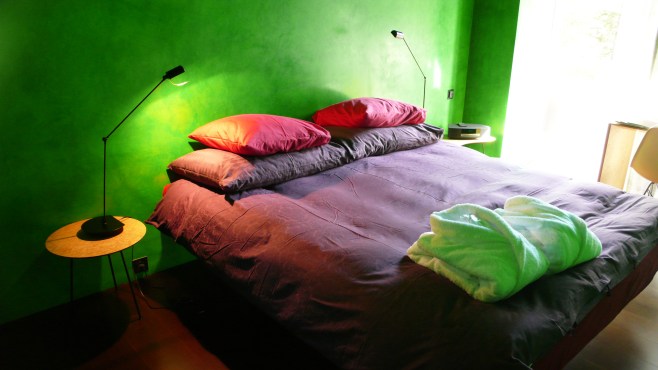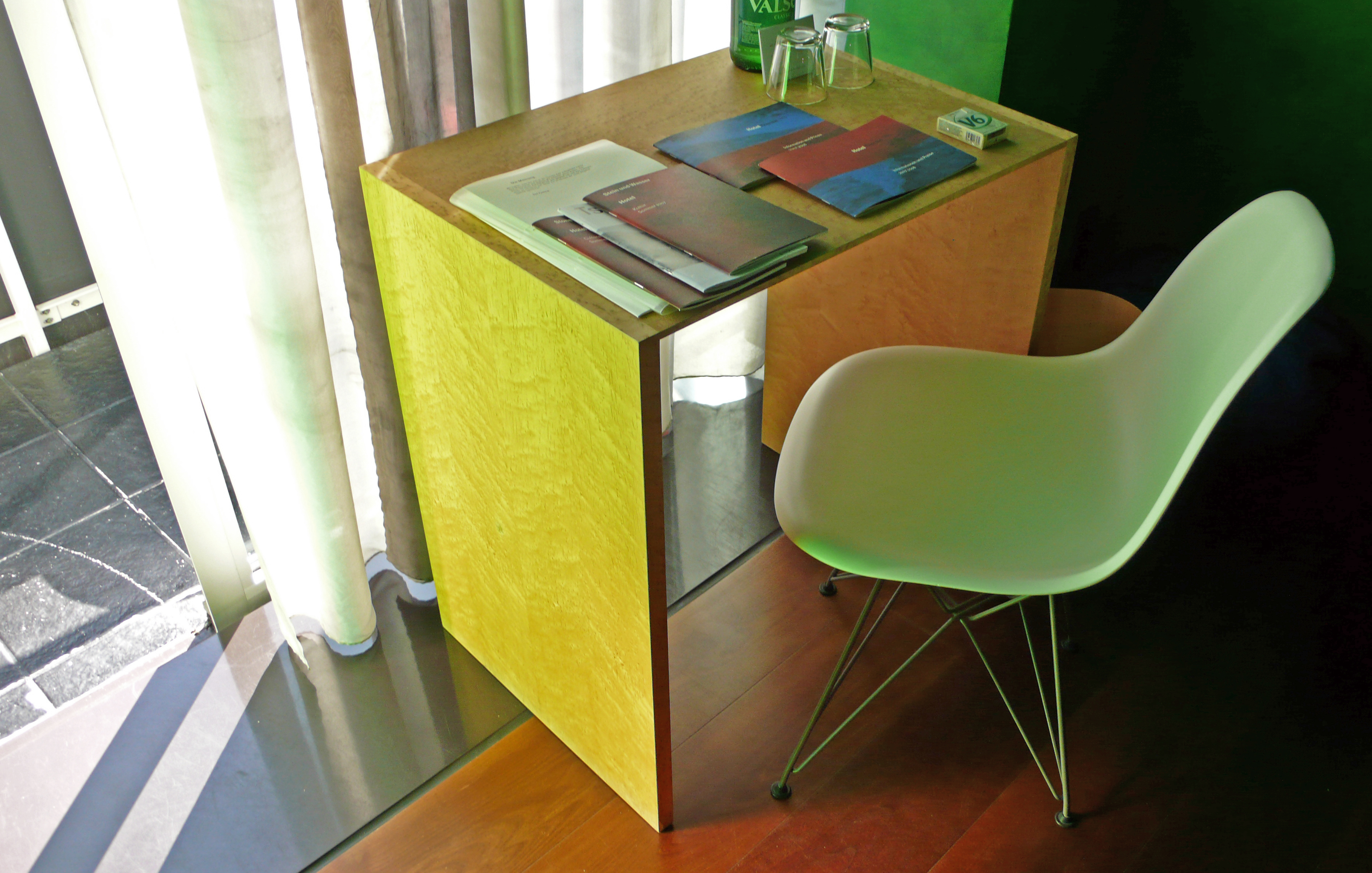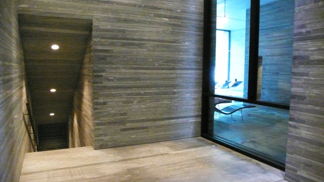 voici un premier aperçu de notre chambre. les chambres « selva stucco » (18 au total, conçues par paire de même couleur: vert mousse, jaune naples, ébène, ultramarine, bleu cobalt et rouge rubis) ont été repensées par peter zumthor en 2005 avec des meubles de designers du 20e siècle: d’eileen gray à le corbusier, en passant par mies van der rohe et jasper morrison. deux détails attirent tout de suite l’attention du voyageur: pas de tv ni de mini-bar. la télé, nous informe-t-on, est disponible sur demande sans frais. quant au mini-bar… la literie est signée schlossberg et les lampes de chevet sont de tomaso cimini…