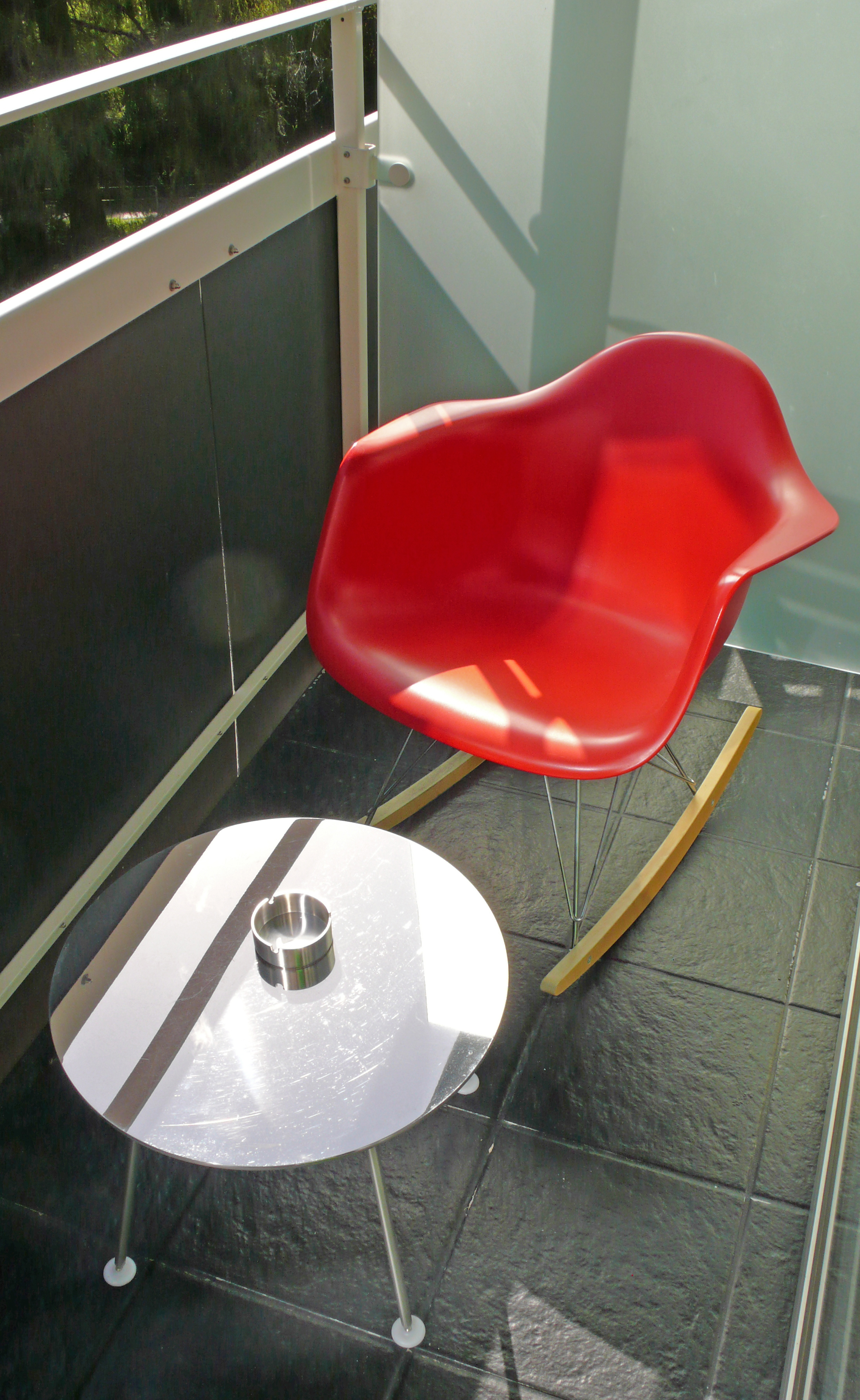 la salle de bains, donnant directement sur la chambre. la vasque est de zumthor, tout comme le lit, la garde-robe, le tabouret et les étagères. cela étant, il faut toujours garder l’esprit critique: je suis fan du design quand il est pratique, utile et pensé pour le quotidien. ici, j’ai eu l’impression à plusieurs reprises que le design avait davantage été pensé pour faire joli. ainsi, à part quelques étagères dans la salle de bains et une (toute) petite penderie dans l’entrée, il n’y avait pas de rangement du tout; l’accès direct et sans séparation de la chambre à la salle de bains n’offre, je sais que c’est voulu, aucune intimité; la porte coulissante des toilettes était très jolie mais… transparente; et la vasque du lavabo était trop petite (bonjour les éclaboussures, presque sur le lit).