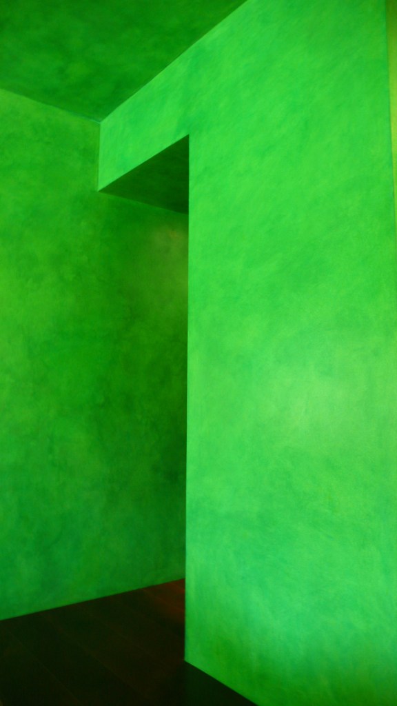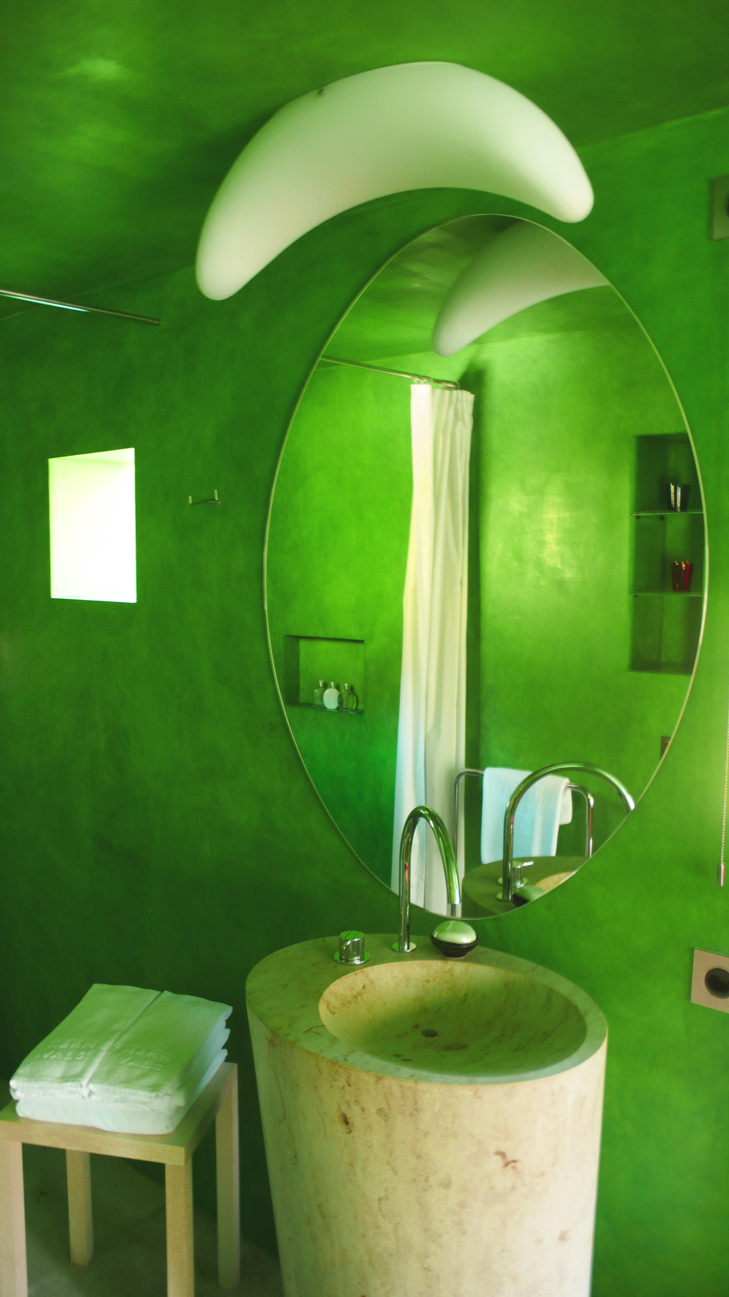le matériau utilisé pour les chambres est le « stucco lustro », plâtre vénitien imitant une technique de peinture utilisée par les grecs anciens. la couleur est diluée avec de la cire liquide et appliquée au plâtre pendant qu’il est encore chaud. dans l’italie de la renaissance, ce matériau était considéré comme le plus haut degré de perfection esthétique dans l’ornement des murs. les couleurs possibles sont virtuellement illimitée. avouez qu’on n’a pas ça tous les jours dans une chambre d’hôtel…
