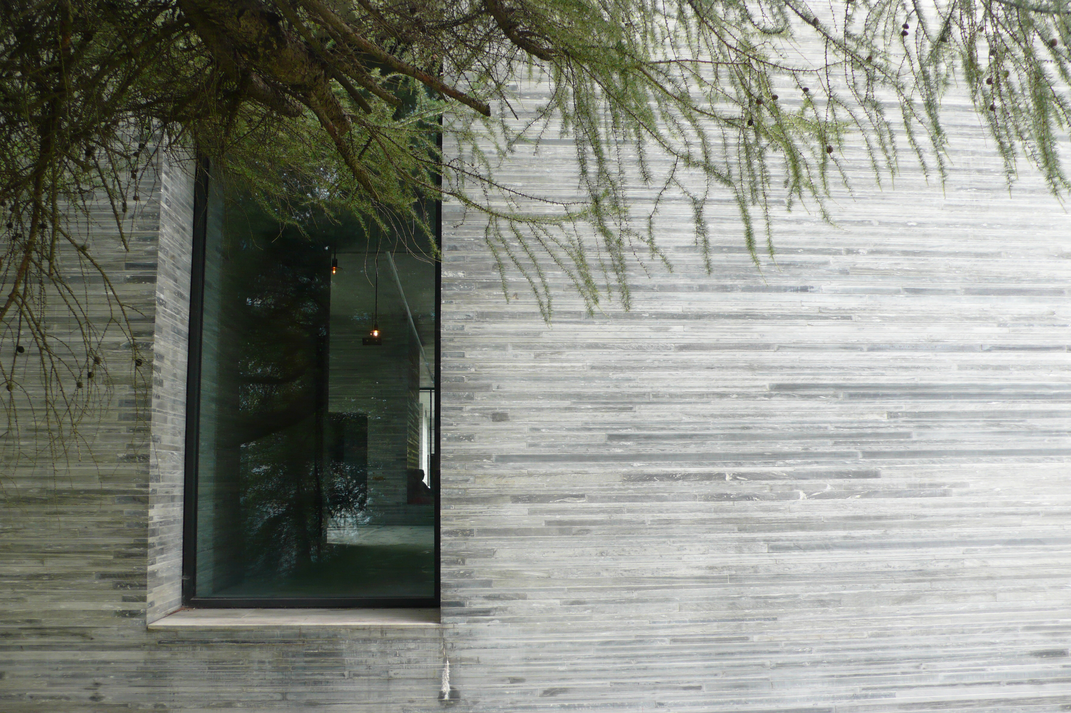 conçues et réalisées par peter zumthor en 1994, voici les thermes de vals, ou du moins un détail de la façade extérieure. tantôt lisses, tantôt accidentés, les murs sont constitués de 60’000 plaques de quarzite donnant à l’ensemble une teinte vert pâle, à la fois très sereine et très contemporaine…