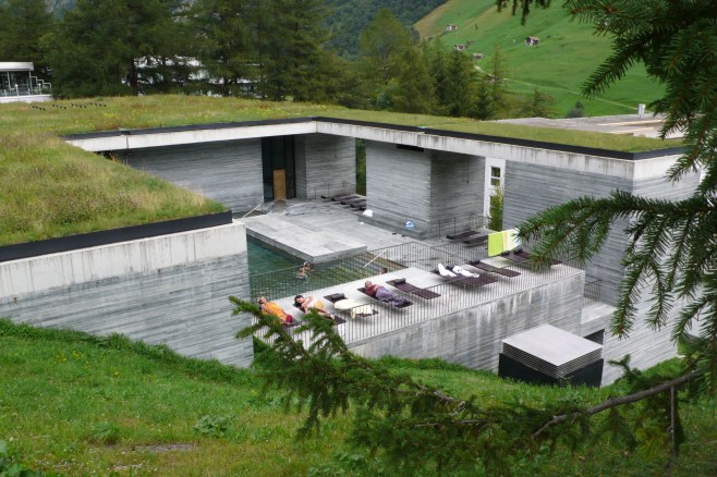 thermes. le toit végétalisé du bassin principal offre un contraste surprenant avec l’architecture du bâtiment qui, du coup, s’intègre bien à l’environnement naturel. les lampes sont là pour recréer un éclairage diurne le soir venu.