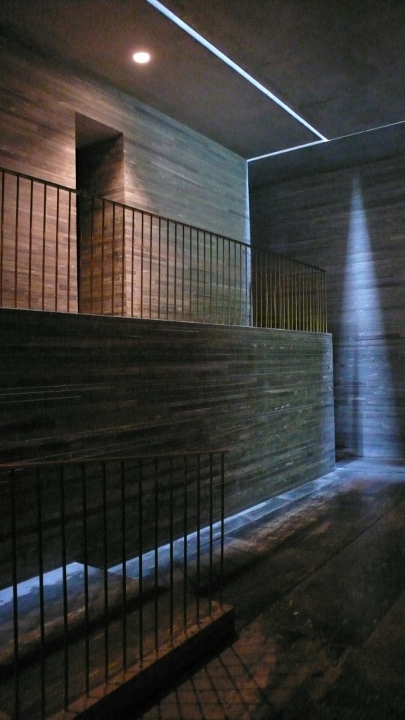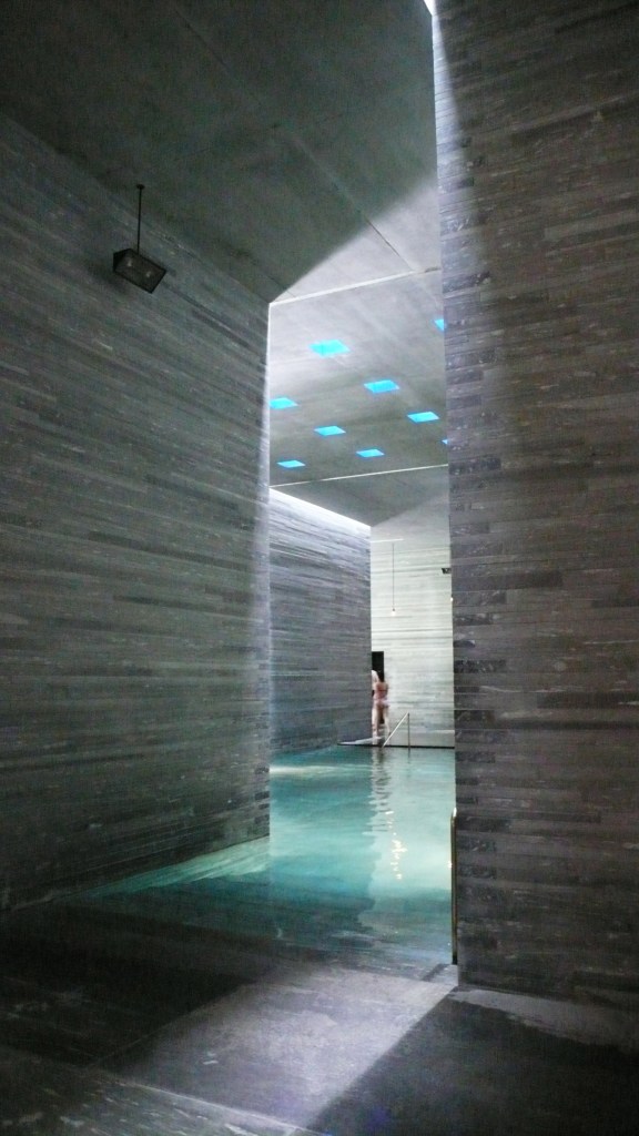 à côté de bassins assez larges, de petites pièces sans fenêtre: ici le bassin à 33°, rempli de pétales de fleurs qui créent une ambiance au parfum subtil; là le « bain sonore » à 35° (3×3 très haut de plafond) où tous les sons (écoulement des eaux, tuyauteries, machines) de l’endroit y convergeant, on a l’impression d’entendre la complainte d’un extraterrestre blessé appelant à l’aide ses congénères au moyen d’un appareil inconnu de nous, ou encore une baleine appelant son petit. c’est un endroit hors du temps et hors du monde, très proche de l’univers de lara croft (à croire que les créateurs ont séjourné à vals). un spot éclaire les jambes mais l’eau est si ferrugineuse qu’on ne distingue même pas ses pieds. l’oxygène est si abondant qu’il recouvre, encore plus qu’ailleurs, la peau en couche fine et régulière. d’un geste de la main, on se frotte la jambe et c’est comme si l’on se débarrassait d’une couche de talc; plus loin, le bassin à 42°, où l’on entre comme dans un bain très chaud, c’est-à-dire avec précaution. plus loin, une petite salle où l’on peut écouter des percussions douces, censées relaxer dans une atmosphère très « hors du temps ».