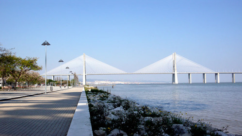 ce pont à haubans fait 18 km de long et relie les deux rives de l’embouchure du tage. l’une des constructions les plus complexes de la fin du xxe siècle.