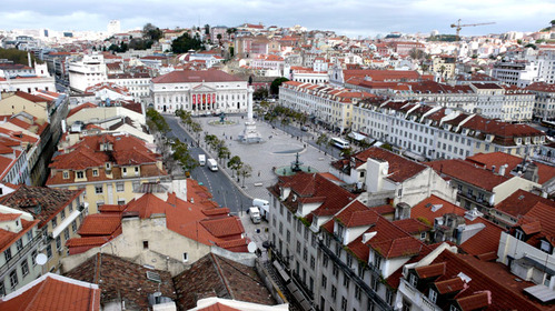 praça de figueira. depuis la plate-forme de santa justa, on peut voir les quartiers immédiats de baixa, du rossio et du chiado ainsi que, plus loin, le château de são jorge et le bairro alto.