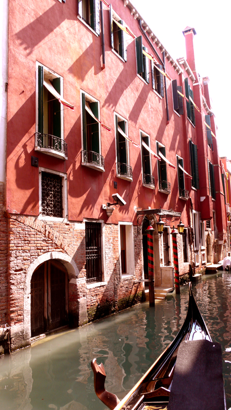 bah oui, mais j’assume pleinement ma touristitude. ce que j’ai un peu moins assumé, par contre, c’est le prix (€150 pour 40 minutes). heureusement que le gondolier était sympa et qu’on a pu lui poser des tas de questions: par exemple, quelle est la différence entre les maillots rayés bleus et les maillots rayés rouges des gondoliers (le nôtre portait un bleu)? le rouge est plus traditionnel, paraît-il. ou encore est-il difficile de manoeuvrer une gondole?. quand on sait qu’il leur faut parfois, pour passer sous un pont, incliner la gondole pendant tout le temps du passage, tant la proue et la poupe sont hautes, et que les canaux sont loin pour certains d’être des avenues…