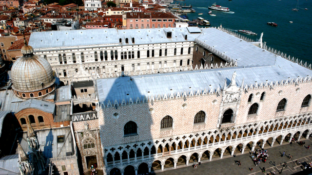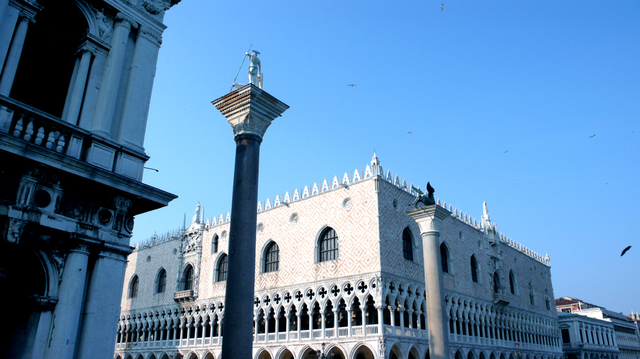 palazzo ducale. le palais des doges était à l’origine une forteresse. le premier a été construit au ixe siècle et les palais qui lui ont succédé sur le même emplacement ont tous été la proie des flammes. le palais actuel a été construit durant les xive et xve siècles et comporte une particularité architecturale: au lieu de construire un étage élégant sur un rez-de-chaussée robuste et massif, les architectes ont fait reposer la masse rose du palais sur une loggia très aérée en pierre blanche.