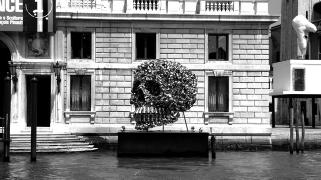 crâne. une oeuvre composée de pièces de métal et exposée, sûrement dans le cadre de la biennale, juste en face de la peggy guggenheim collection.