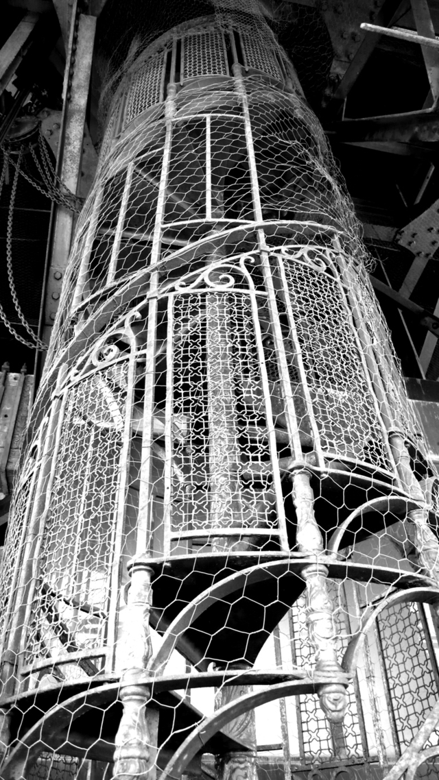 escalier. au sommet du campanile se trouve ce charmant petit escalier en colimaçon à la cage ouvragée, et qui donne accès aux cloches. dieu merci, nous étions déjà en bas quand elles se sont mises à sonner.