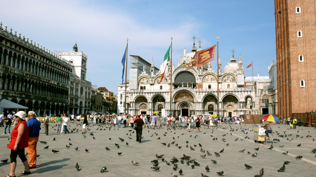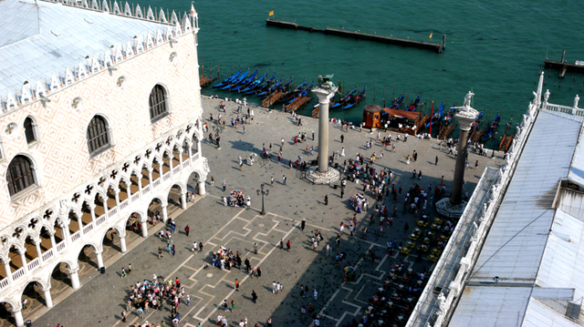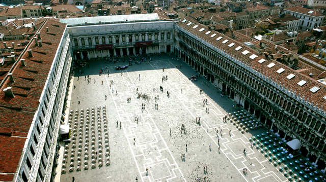 piazza san marco. superbe place où les hommes et, à plus forte raison, les pigeons, sont d’une dérisoire minusculitude. si vous me demandez ce que signifient les dessins géométriques blancs, je vous répondrai que ce sont des dessins géométriques blancs tracés là pour faire joli.