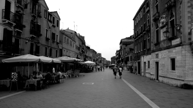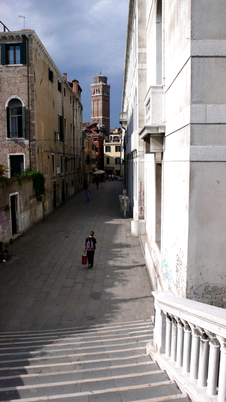 ce qui frappe quand on évolue un peu à venise, c’est l’absence des bruits de la ville: ni sirènes d’ambulances ni moteurs de voitures ni camions poubelles. et le plus drôle, c’est que ça frappe « au bout d’un moment », deux jours après l’arrivée. on s’arrête, on écoute, et on s’aperçoit qu’on ne perçoit rien, si ce n’est le ronron des vaporetti, barges et autres vedettes de la police maritime.