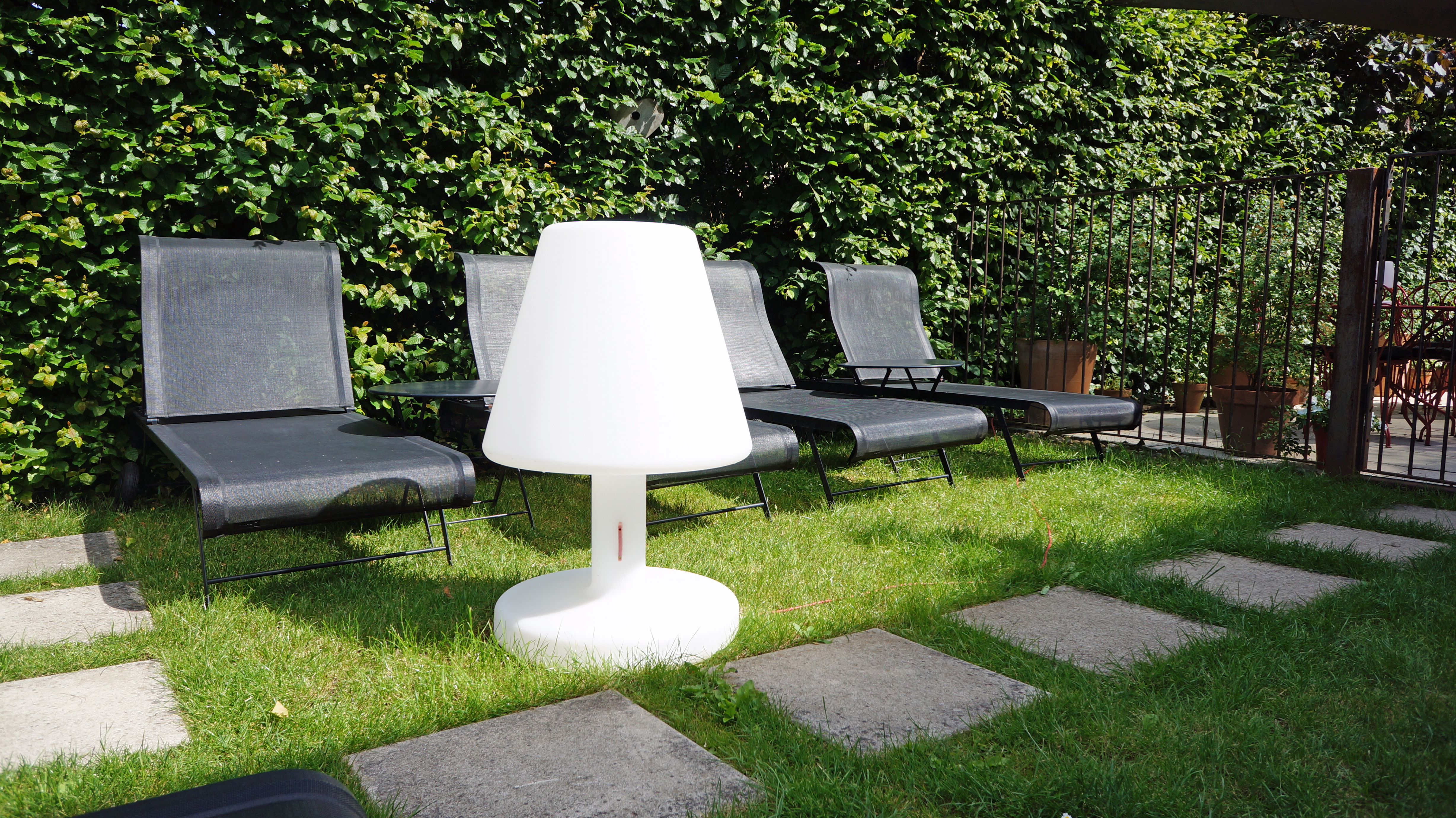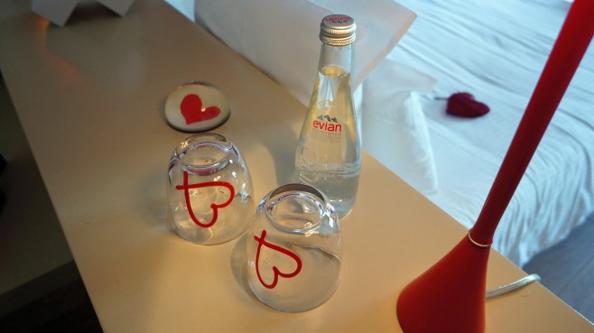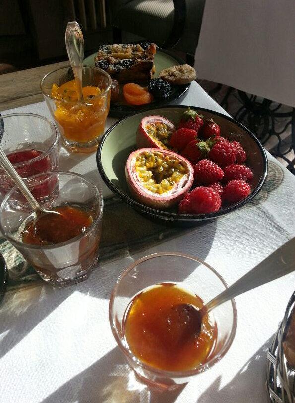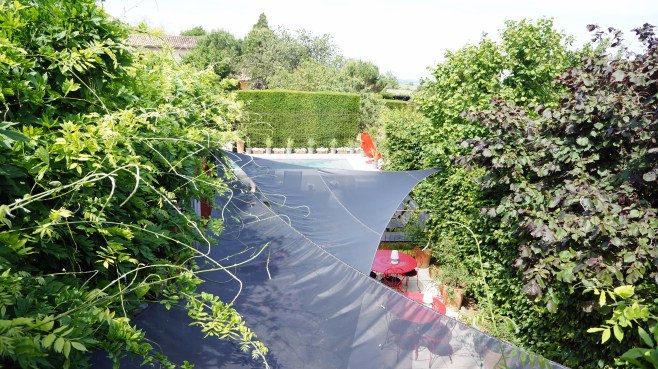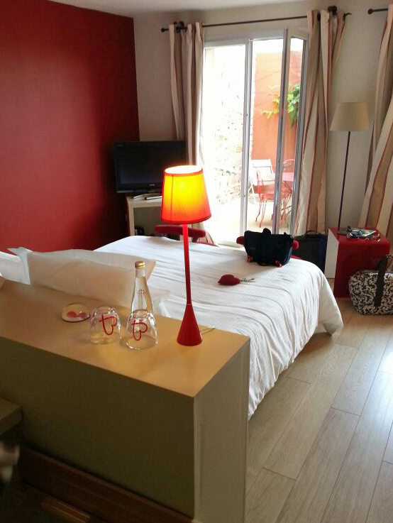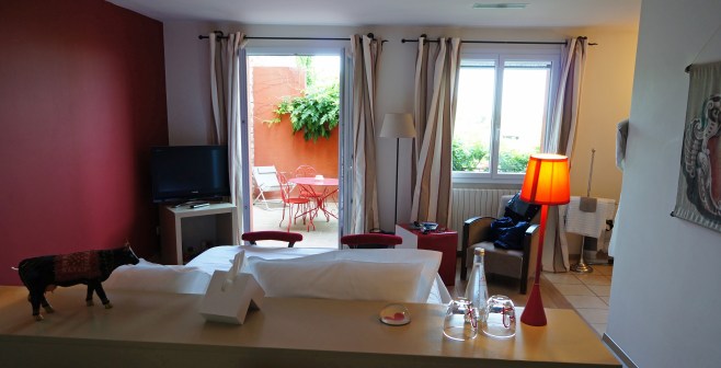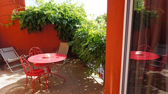 notre chambre possède une petite terrasse privative surplombant le patio, où l’on petit-déjeunera demain matin, et sur la piscine…