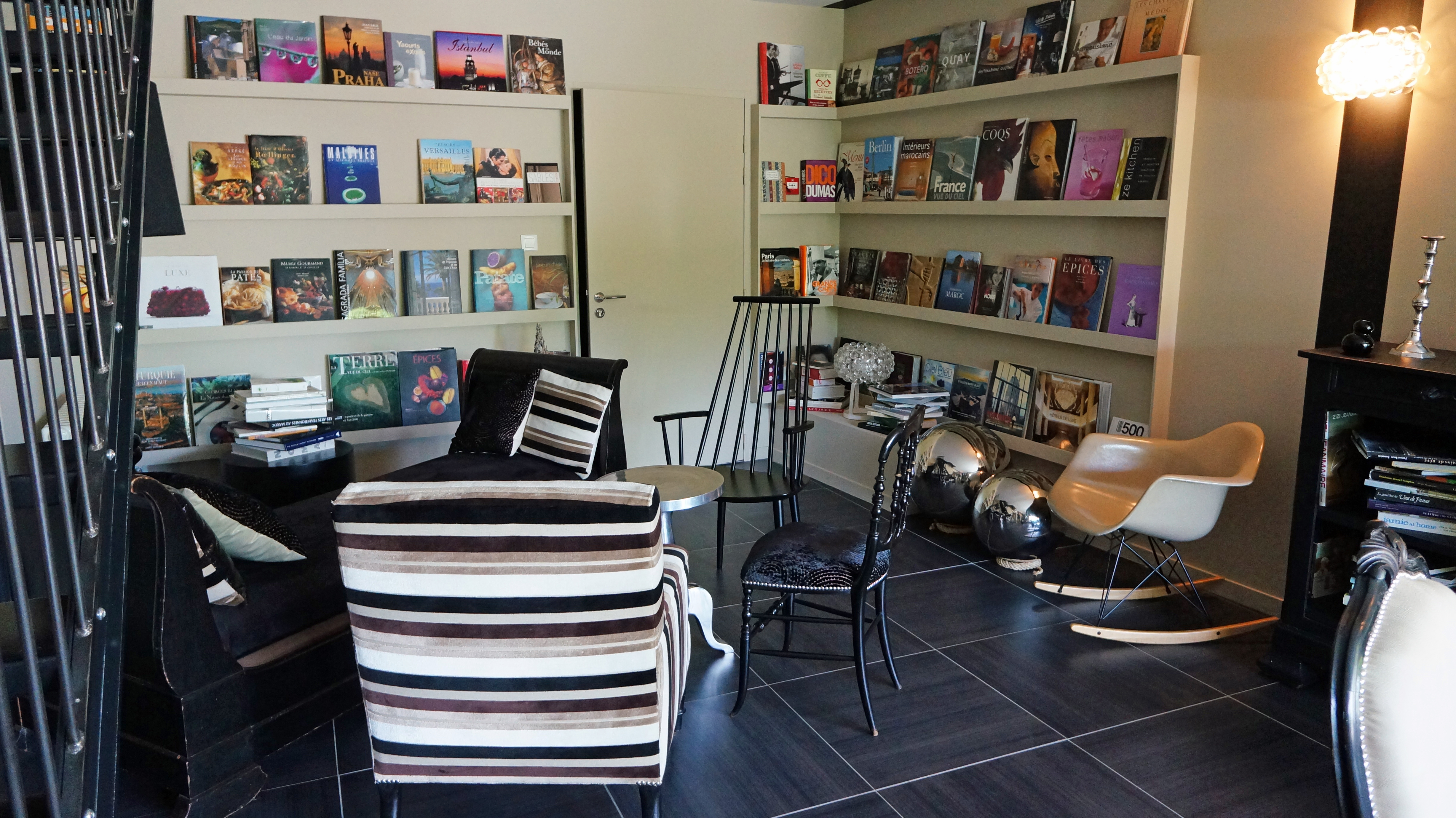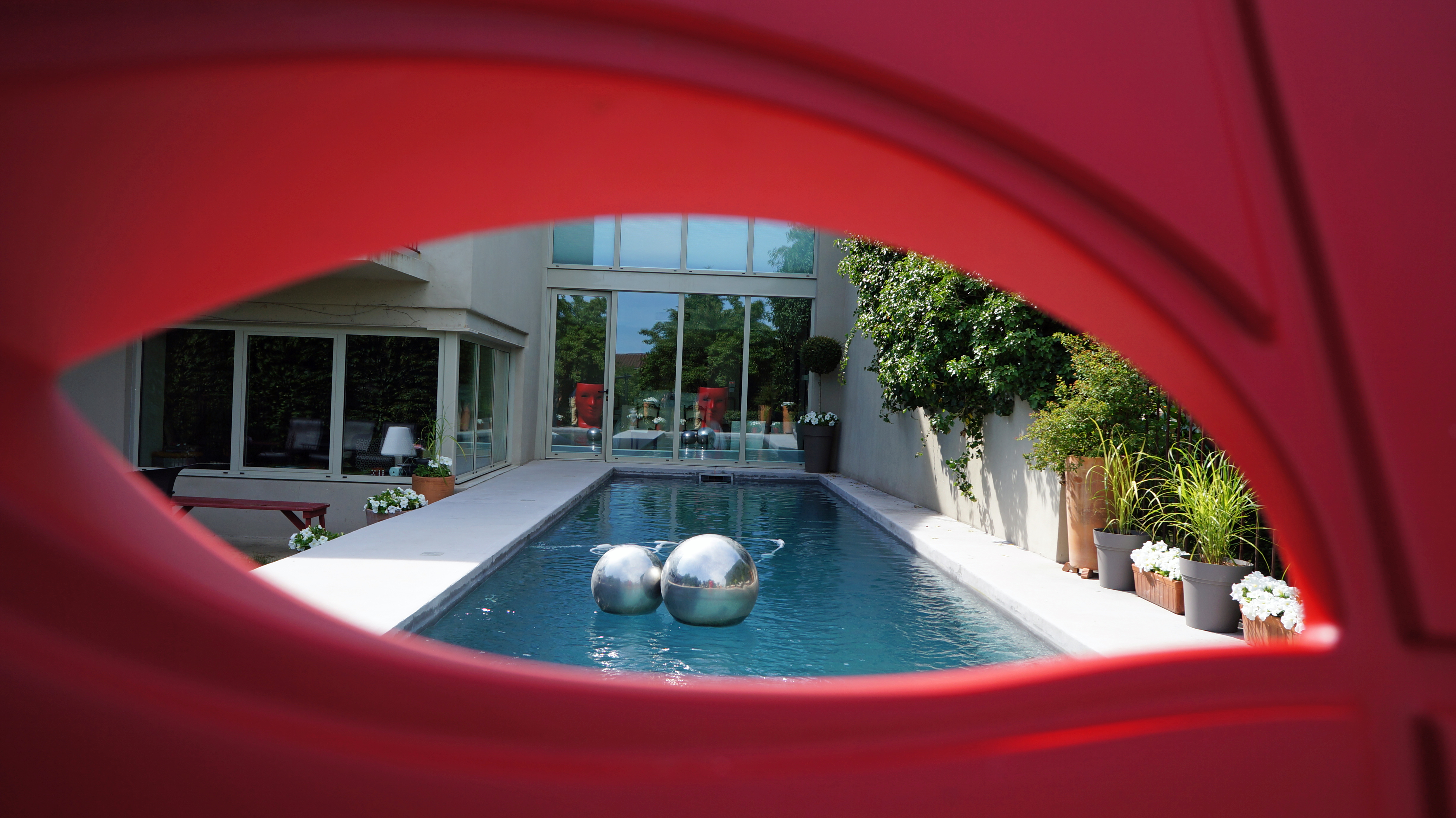 donnant sur la piscine, le petit salon de lecture aux styles mélangés. la chaise eames à bascule n’aura échappé à personne…