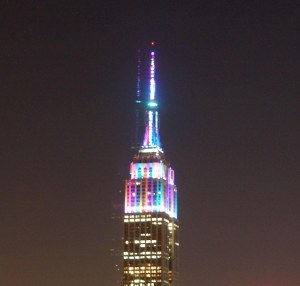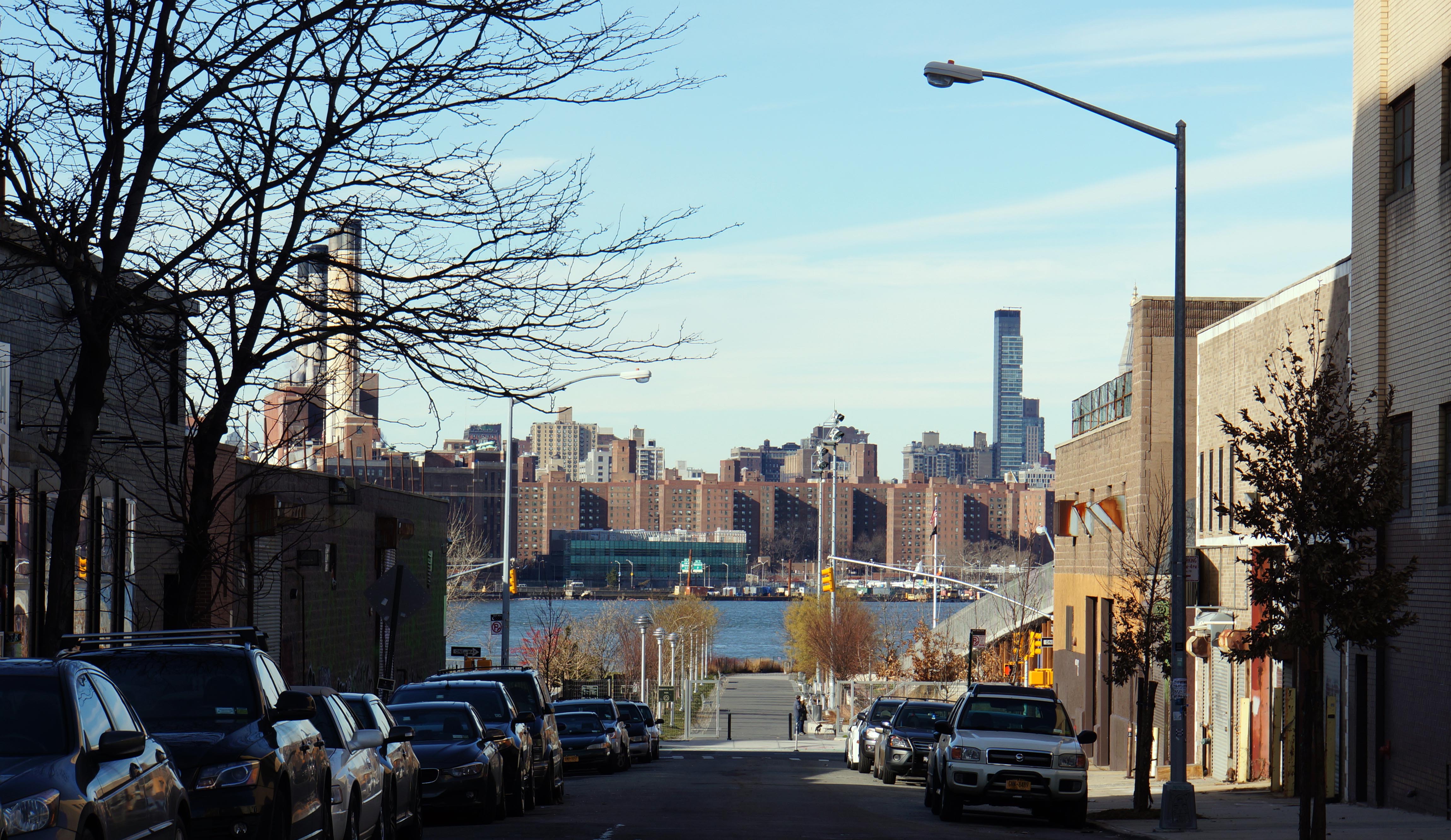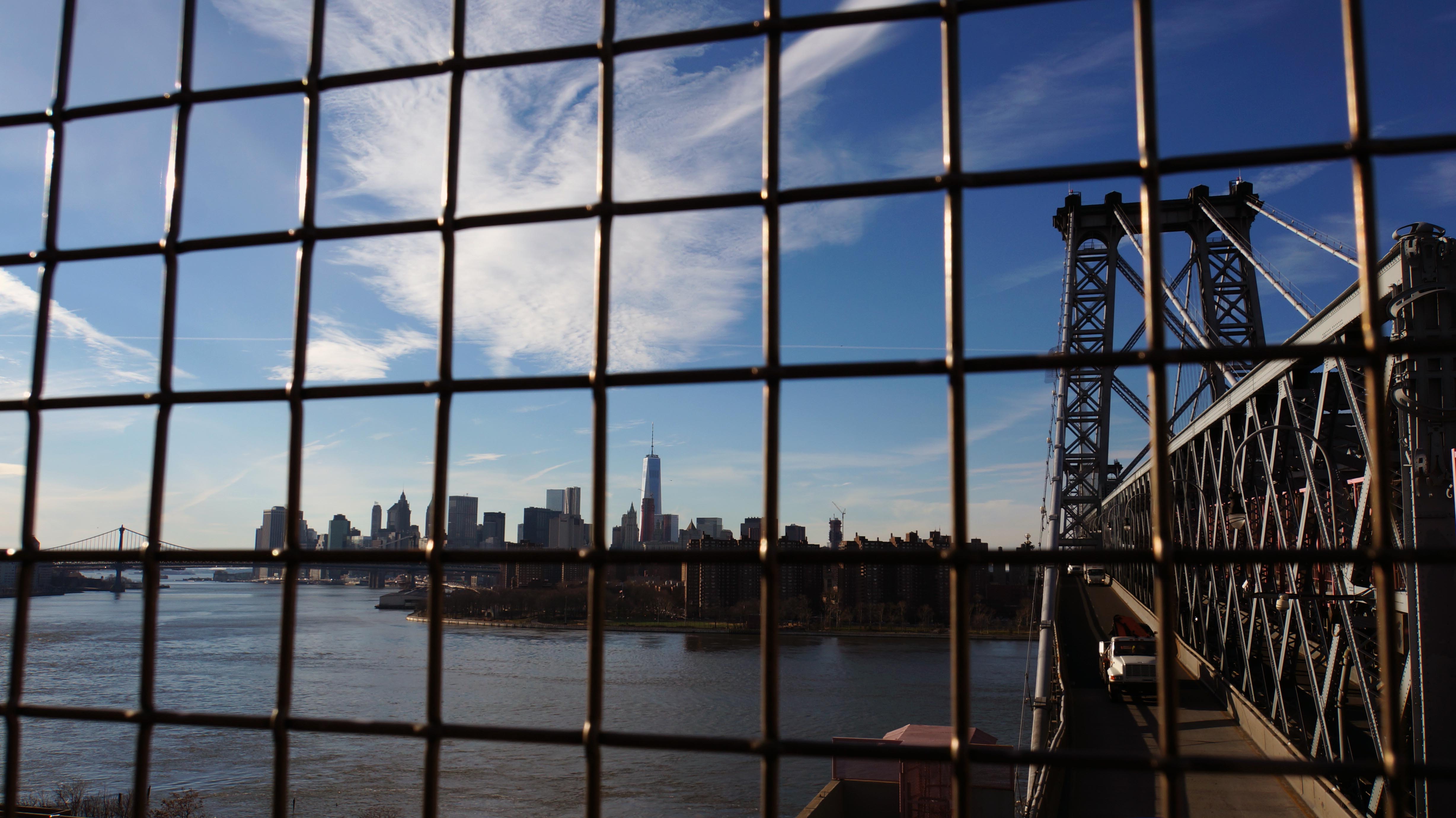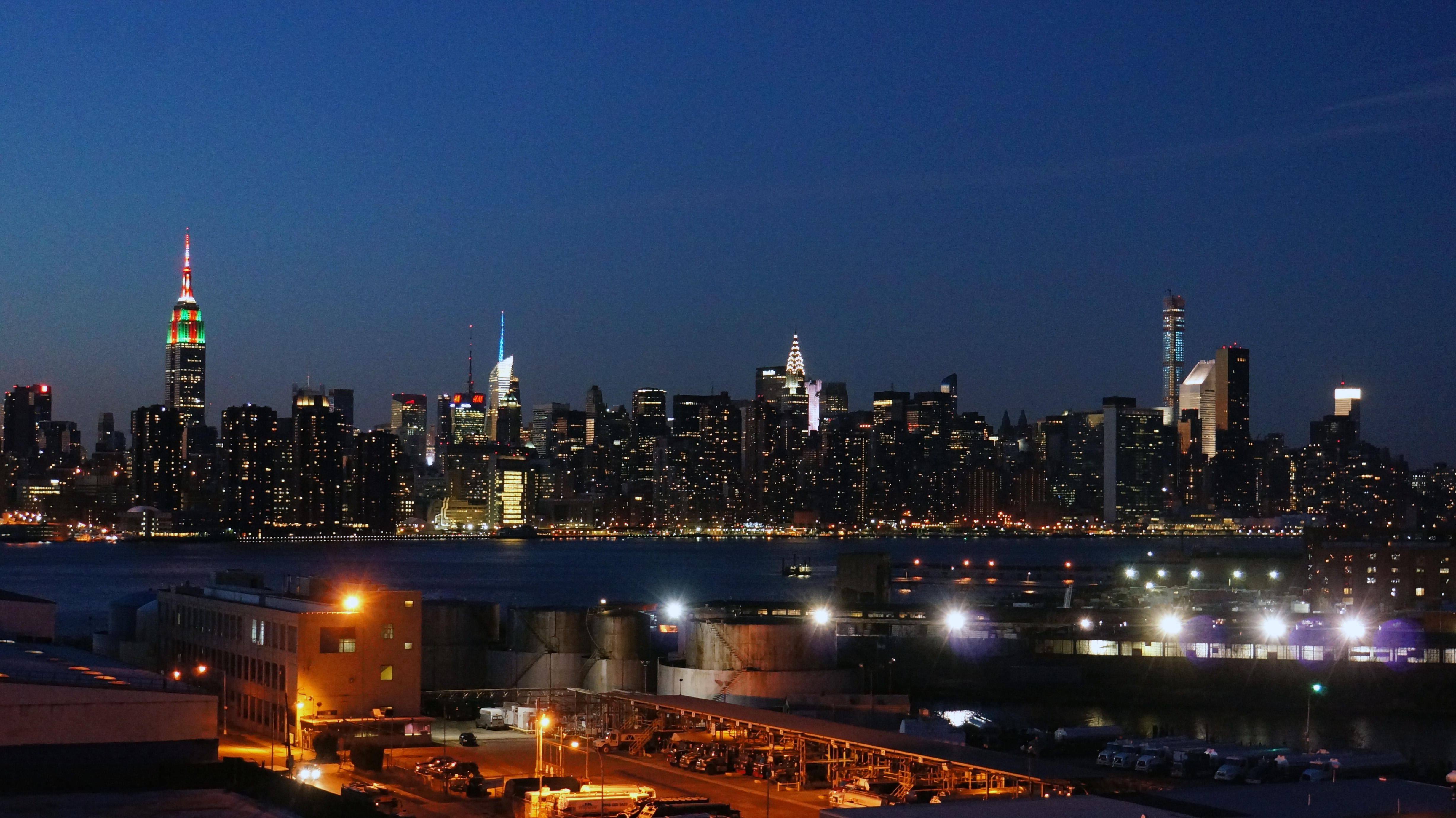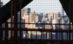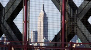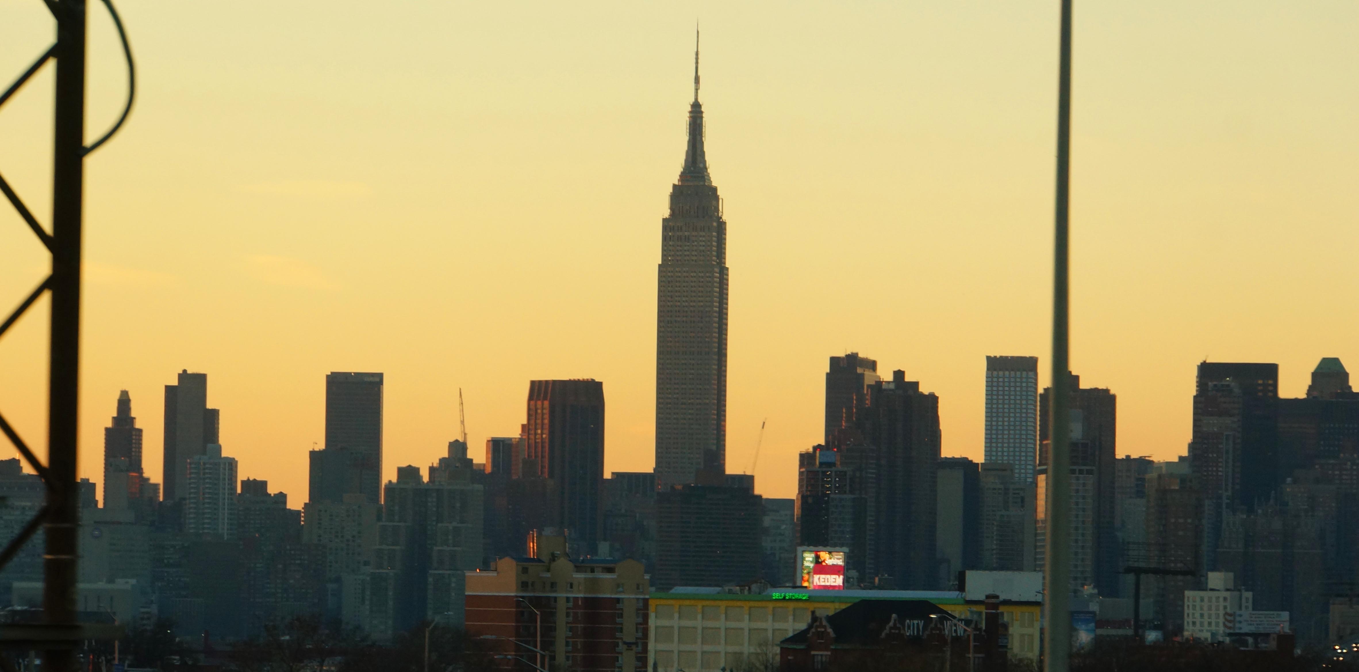 notre autre copain, le corinthien, l’immeuble en forme de pièces de monnaie empilées, depuis le williamsburg bridge.