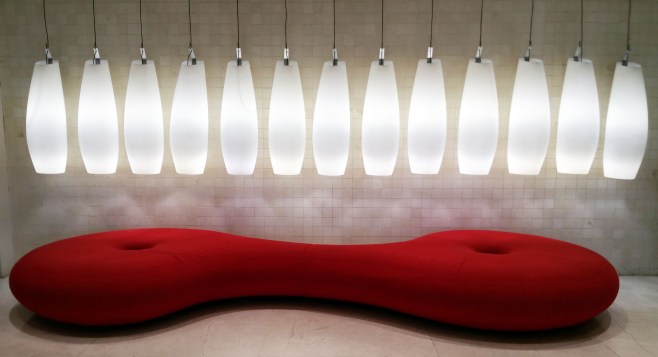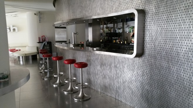le bar de l’hôtel, le splash & crash, où tout n’est que design: les courbes, les matériaux, le mobilier…