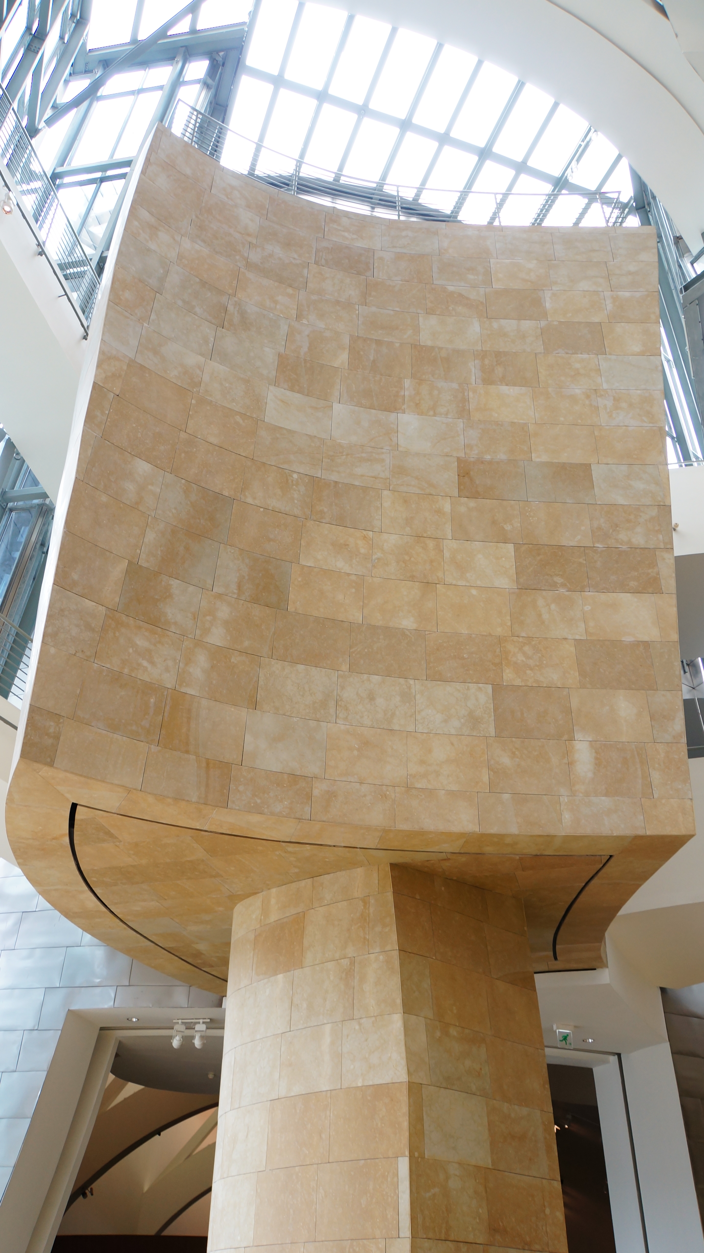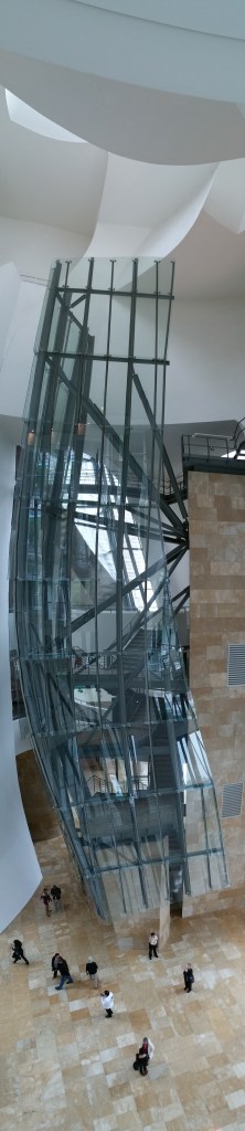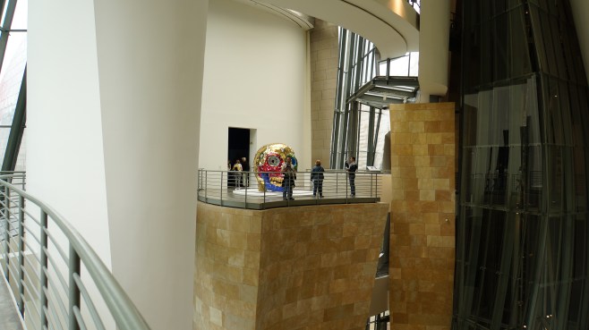 musée guggenheim bilbao – l’intérieur. les trois niveaux s’articulent autour de l’atrium, coeur du musée.