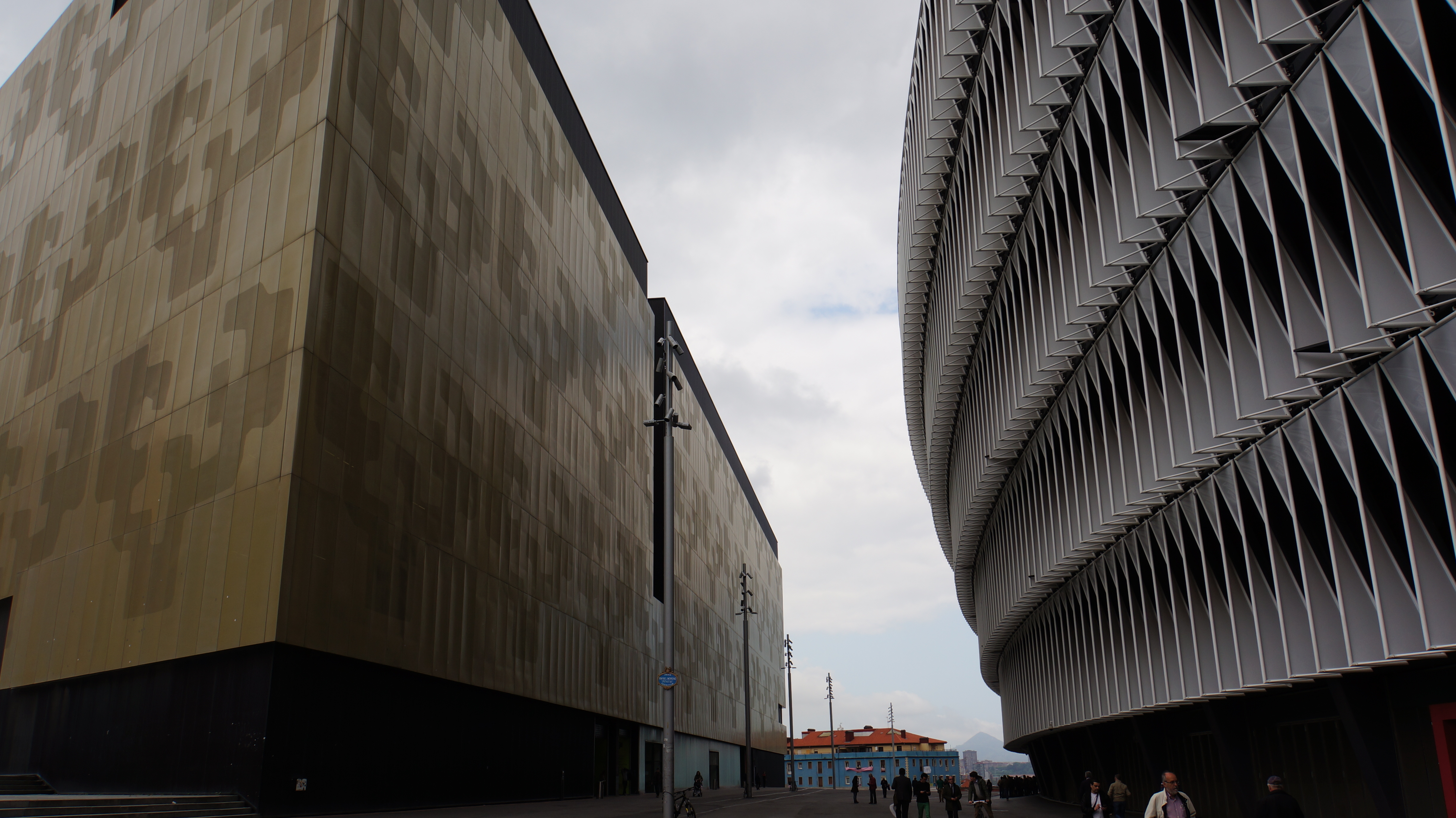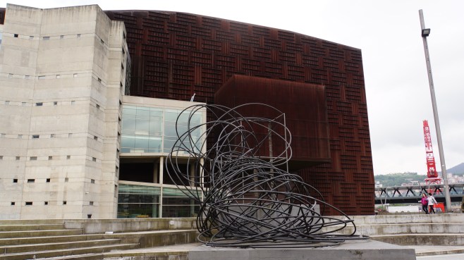 au bord du nervión et juste avant d’arriver aux anciens chantiers navals de la ville, le palacio euskalduna, qui abrite notamment l’orchestre symphonique de bilbao. intitulée « promenade de la mémoire », la sculpture devant est signée josé zugasti.