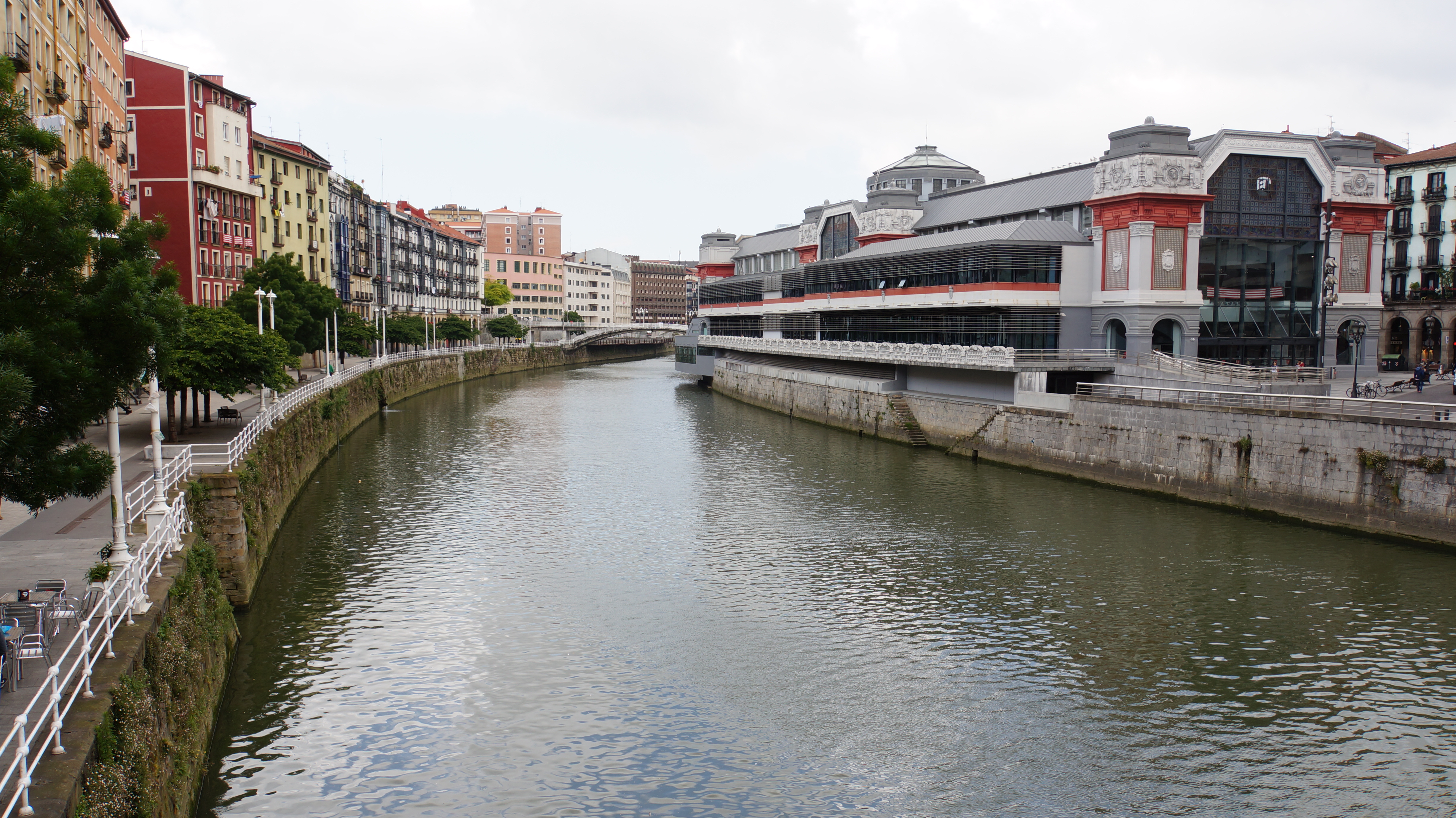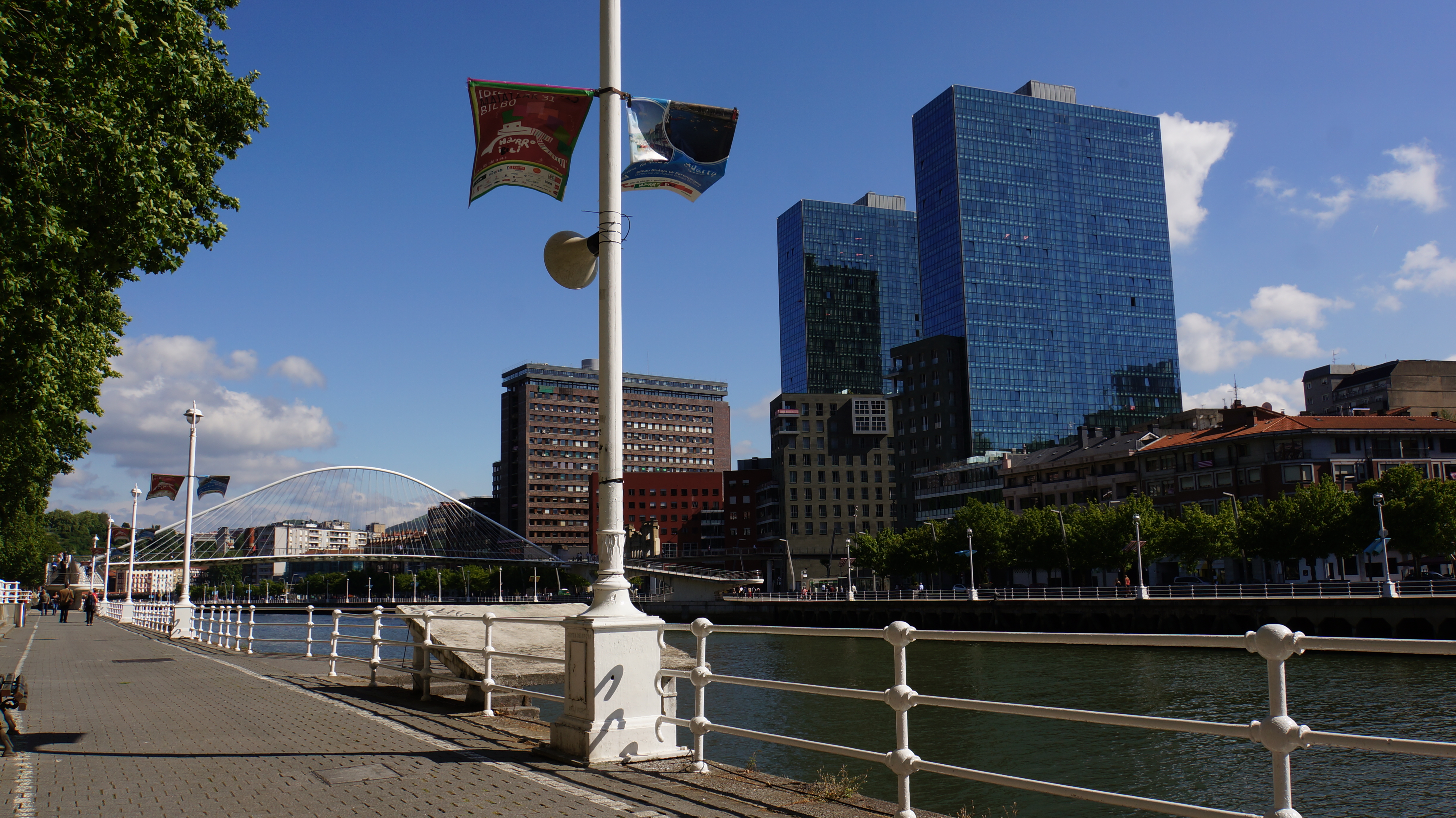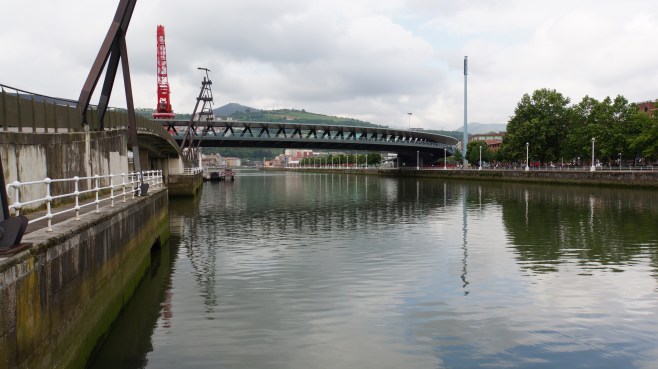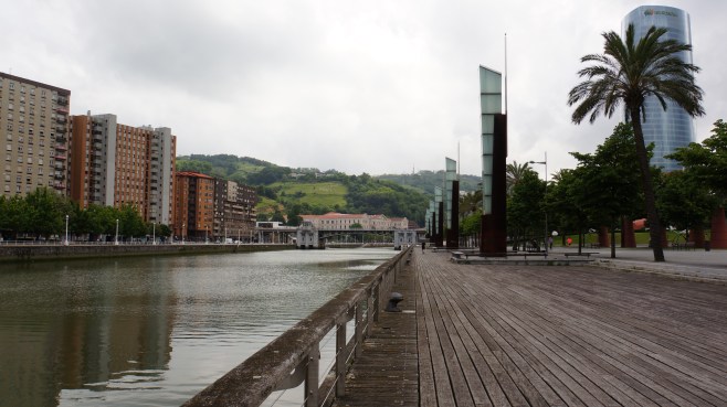 promenade le long du nervión côté nord, en regardant vers l’est et la vieille ville. on aperçoit le zubizuri.