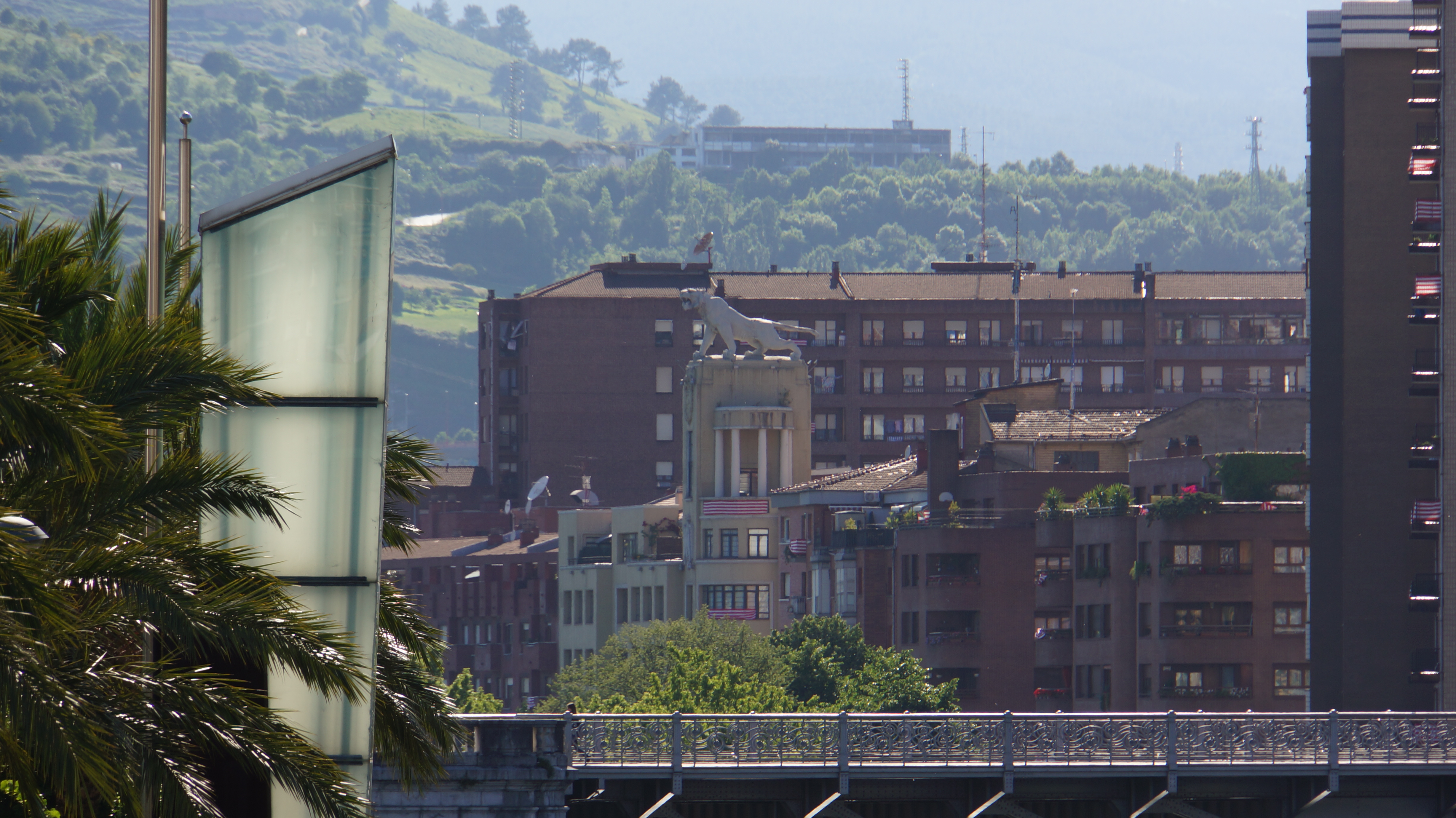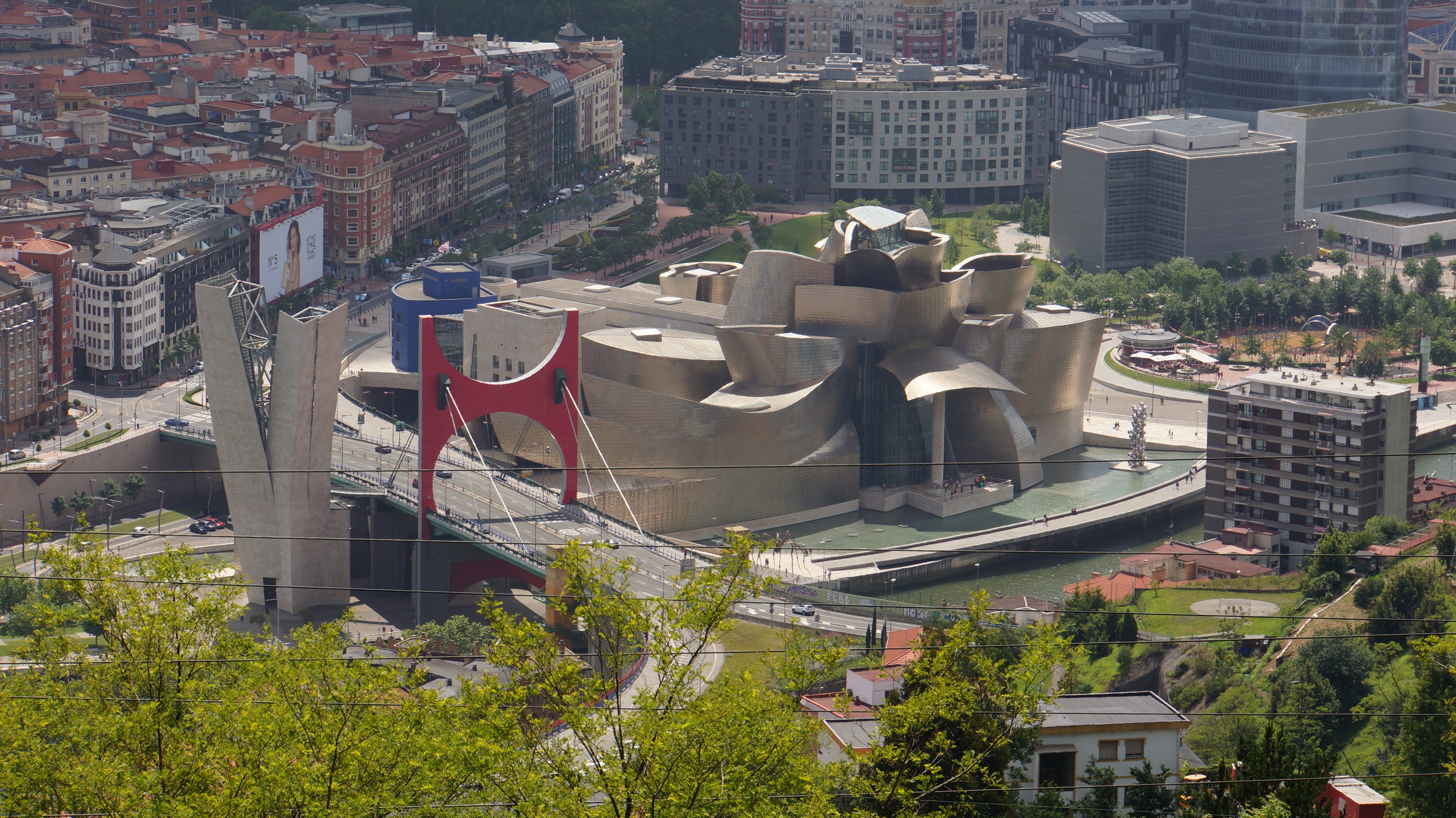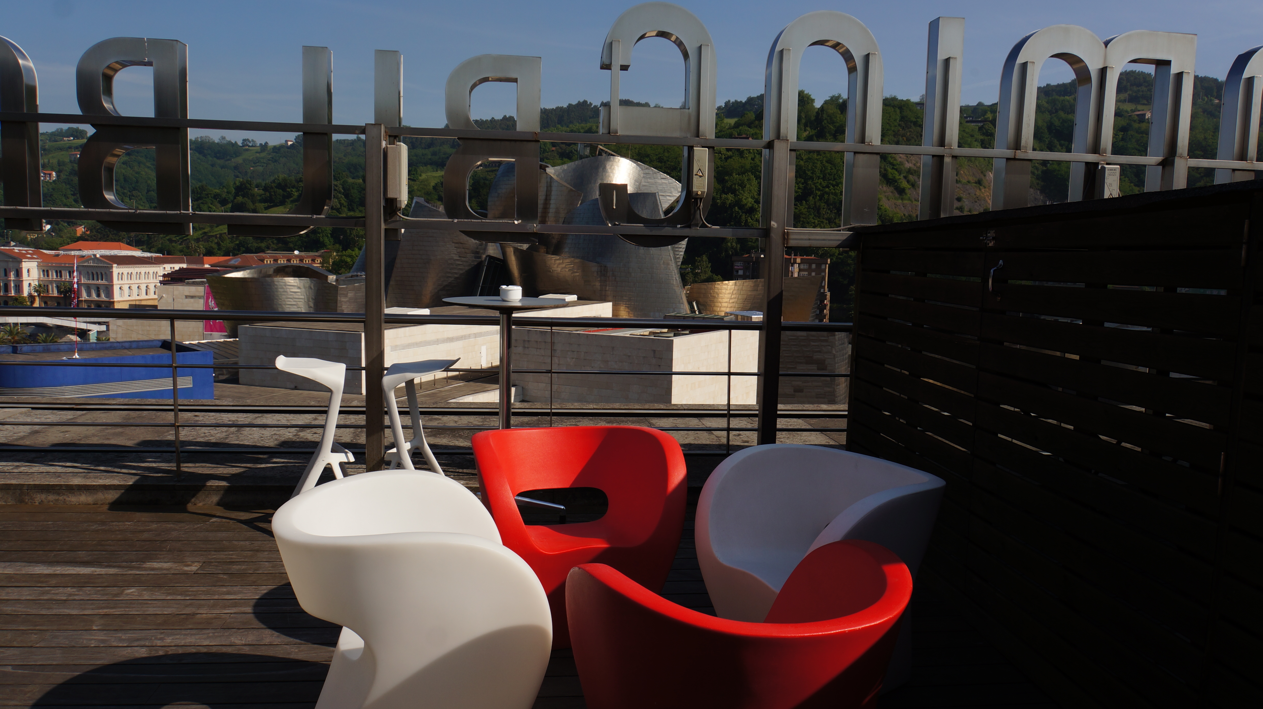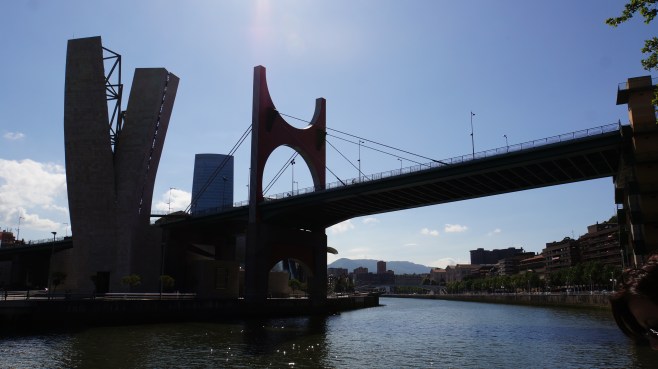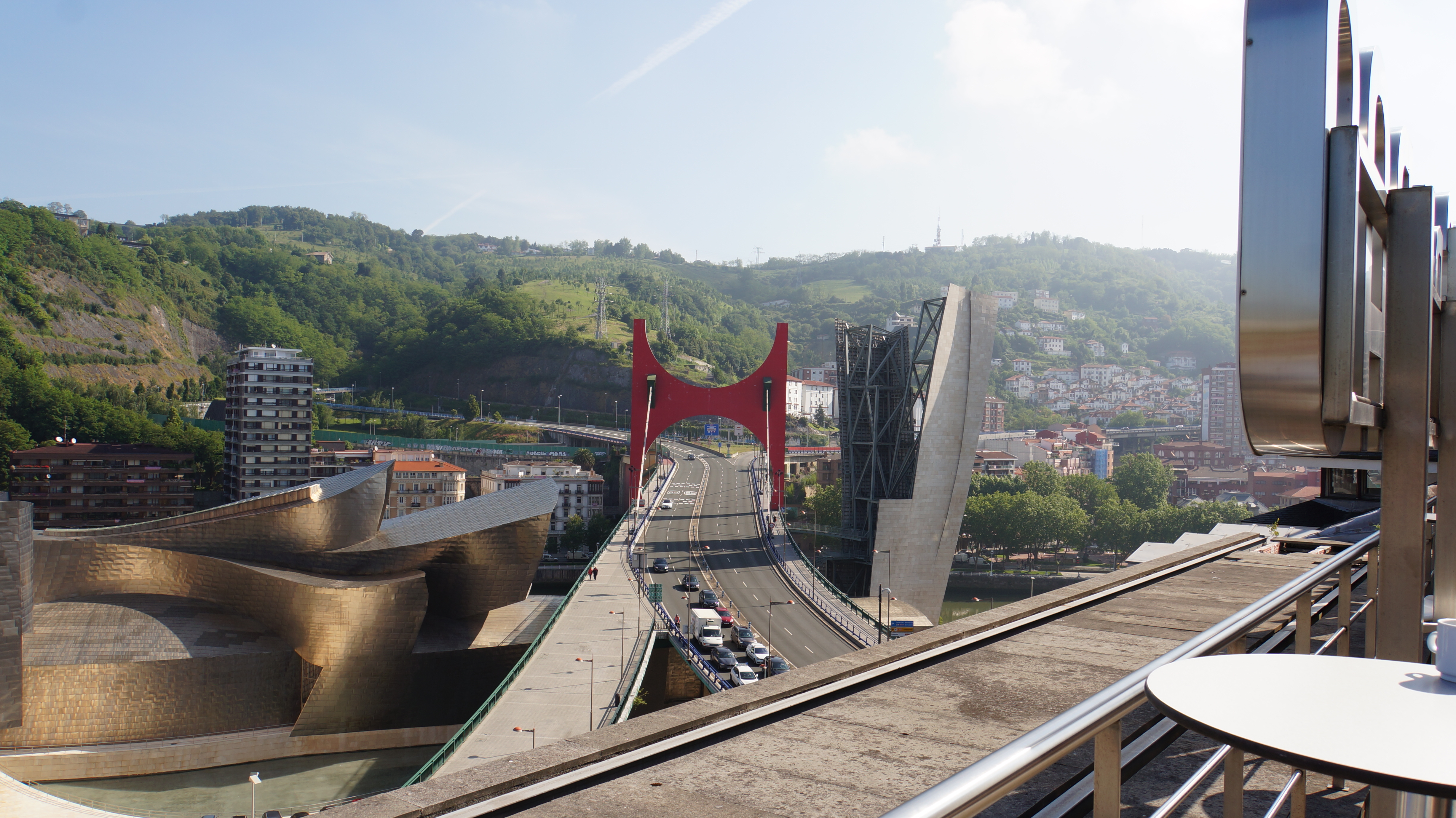 de la terrasse de l’hôtel, on voit le pont de la salve, reliant le centre-ville aux quartiers périphériques, et par lequel on arrive de l’aéroport. son nom officiel est « puente principes de españa ». construit dans les années 1970, il a été intégré au musée guggenheim en 1997. la grande arche rouge, caractéristique du pont et illuminée la nuit, est signée du français daniel buren. elle a été inaugurée lors du 10e anniversaire du musée, en 2007…