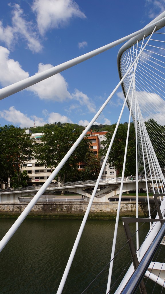 le zubizuri, pont blanc en basque, est une passerelle suspendue conçue par l’architecte espagnol santiago calatrava, celui-là même qui a imaginé l’aéroport. elle a été ouverte en 1997, la même année que le musée guggenheim.