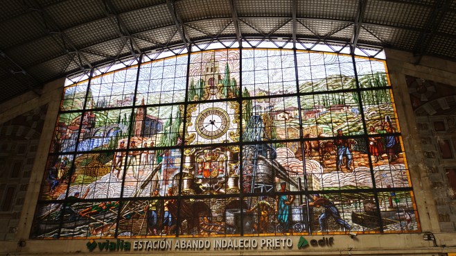 la gare bilbao-abando-indalecio-prieto (bilbao-abando pour les intimes) ou gare du nord, dessinée en 1948 par l’architecte alfonso fungairiño. le vitrail monumental date de la même année.