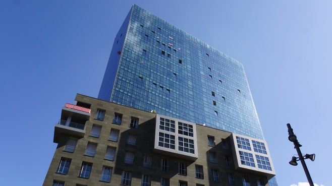 la cour intérieure, avec son obélisque de 7 étages composé de galets et son architecture en forme de vagues, clin d’oeil à la mer toute proche… petit détail marrant, l’un des galets, au sommet, est signé de denis urubko, alpiniste kazakh…