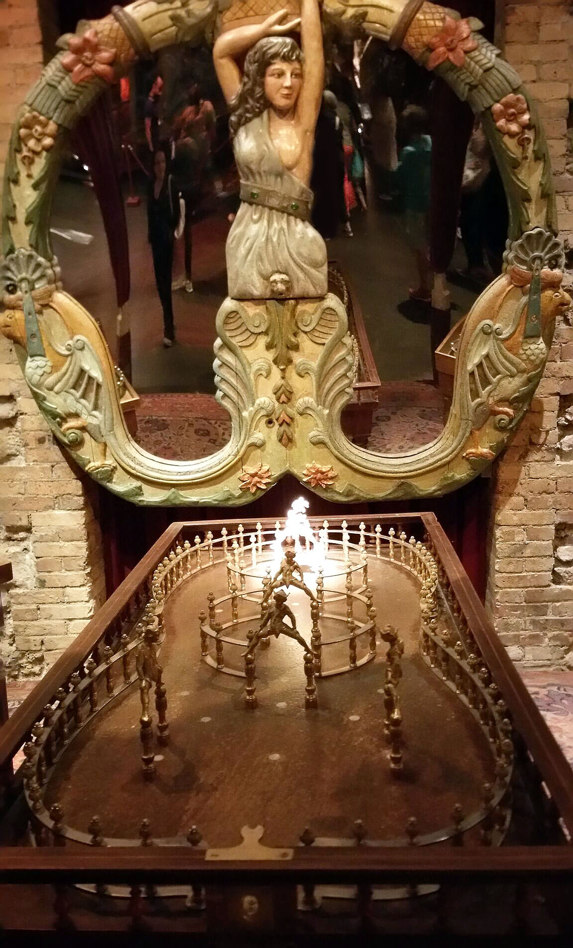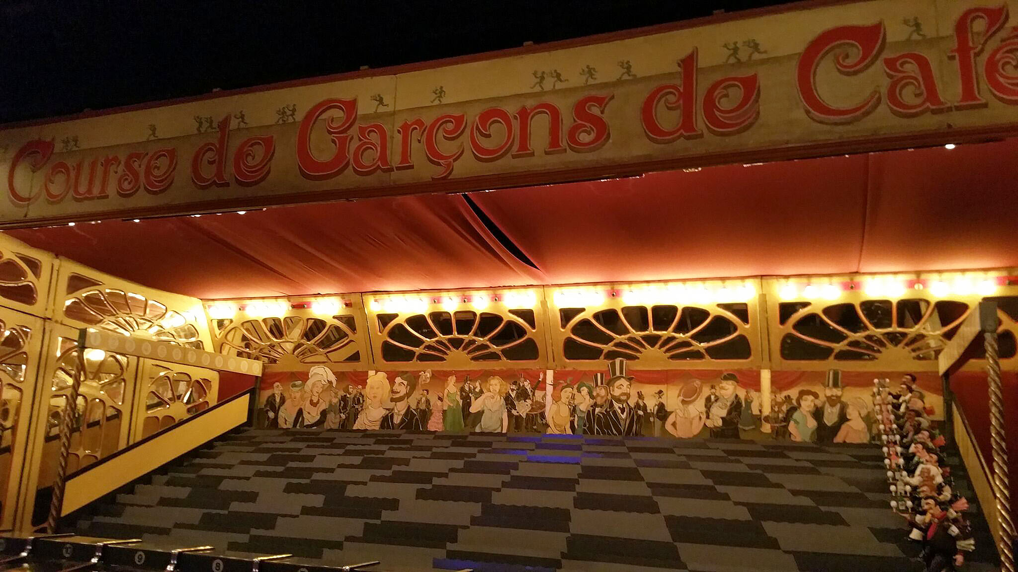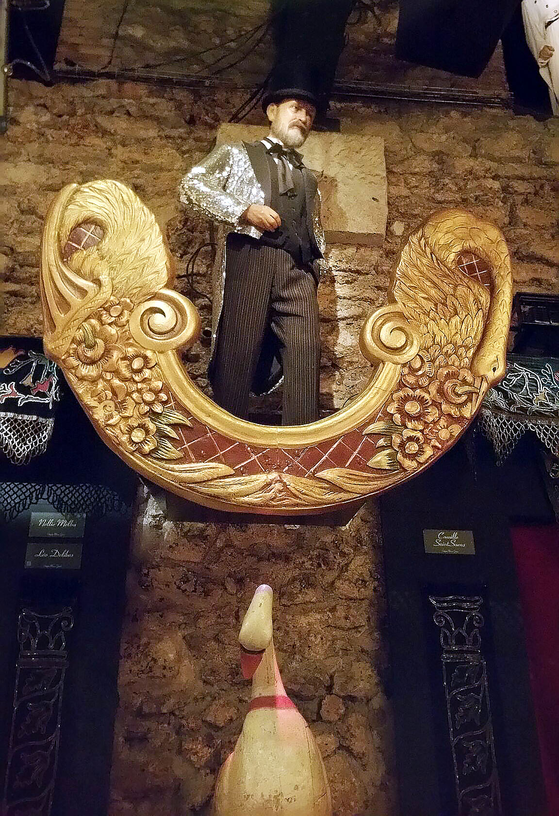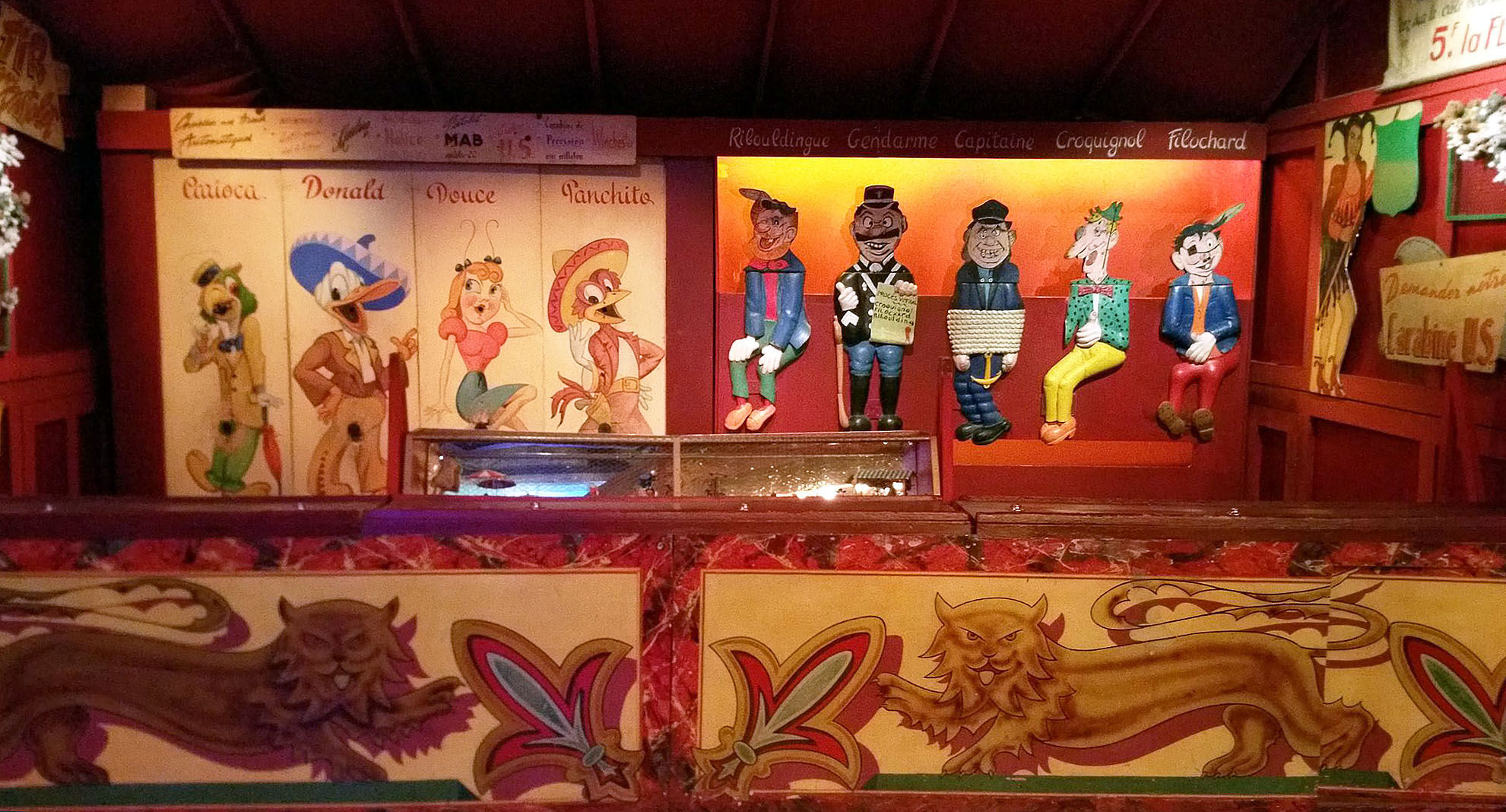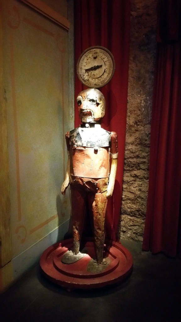 … d’un comédien devenu antiquaire, jean-paul favand. sa collection est riche de plusieurs centaines de pièces qui firent la joie, dans les fêtes foraines, des petits et des grands. né en 1988 et installé à plusieurs endroits, son musée pose ses valises dans les chais lheureux (du nom de la rue) à bercy en 1996. sur 8 500 m2, quatre espaces à la thématique spécifique y sont proposés au visiteur: le musée proprement dit, le théâtre du merveilleux, le théâtre de verdure et les salons vénitiens. guidée, la visite dure en principe 90 minutes (la nôtre en a duré 135 car le guide, à la voix de baryton, était bavard!) permet de parcourir l’histoire du spectacle et de la fête foraine de 1850 à nos jours en essayant certains jeux et attractions.