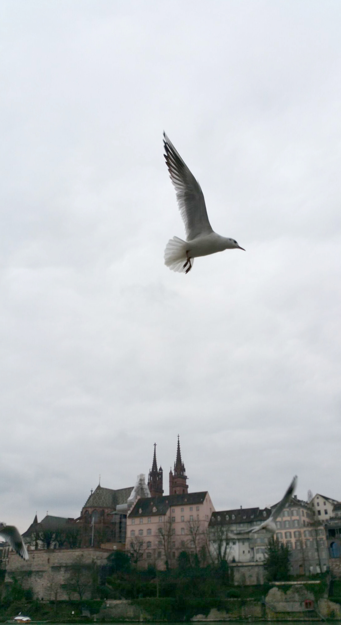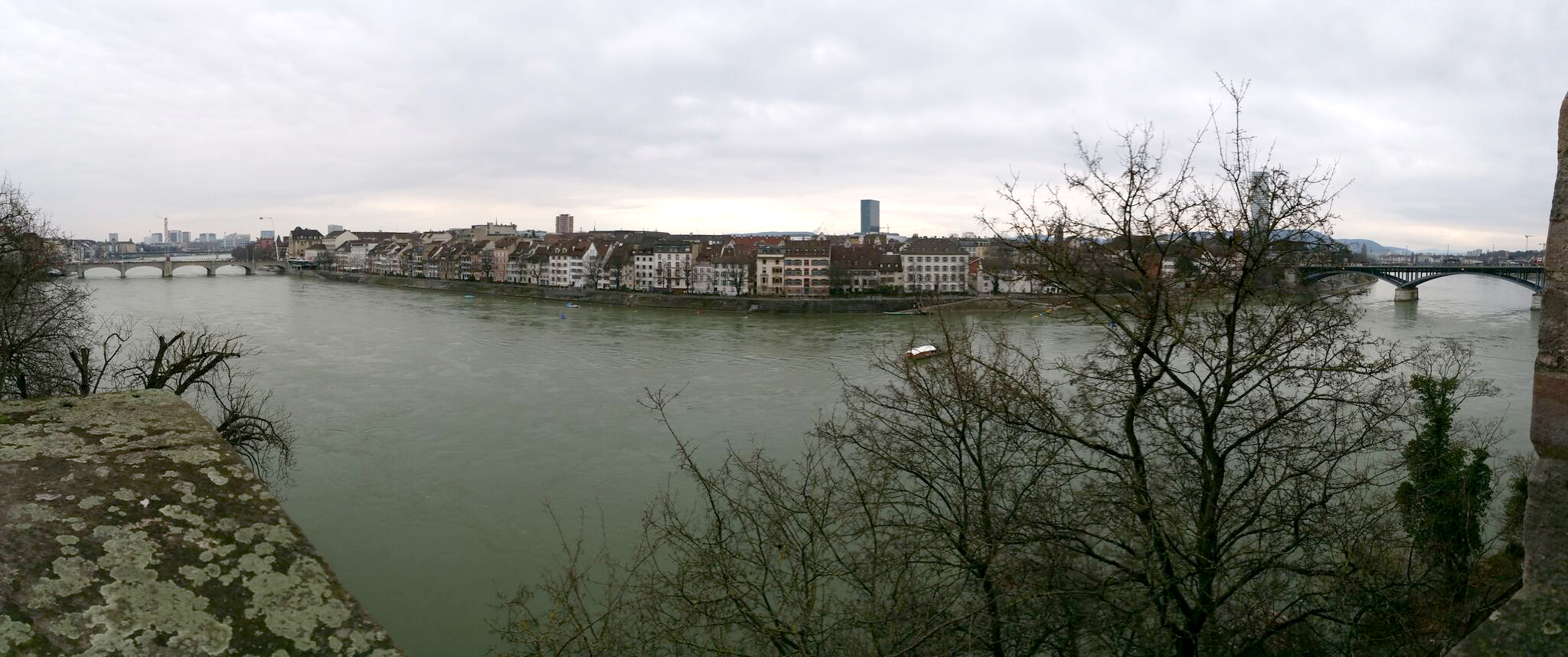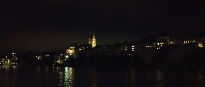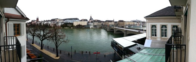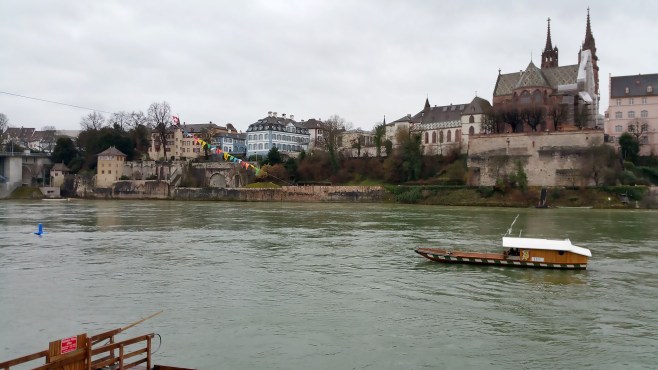 lundi, fin d’après-midi, en retournant à la gare, nous disons au revoir à cette petite ville magnifique et jetons un dernier regard sur le carnaval qui est loin de s’achever. vue panoramique de la rive droite, depuis le pied de la cathédrale, avec à gauche le mittlere brücke et à droite le wettstein brücke.