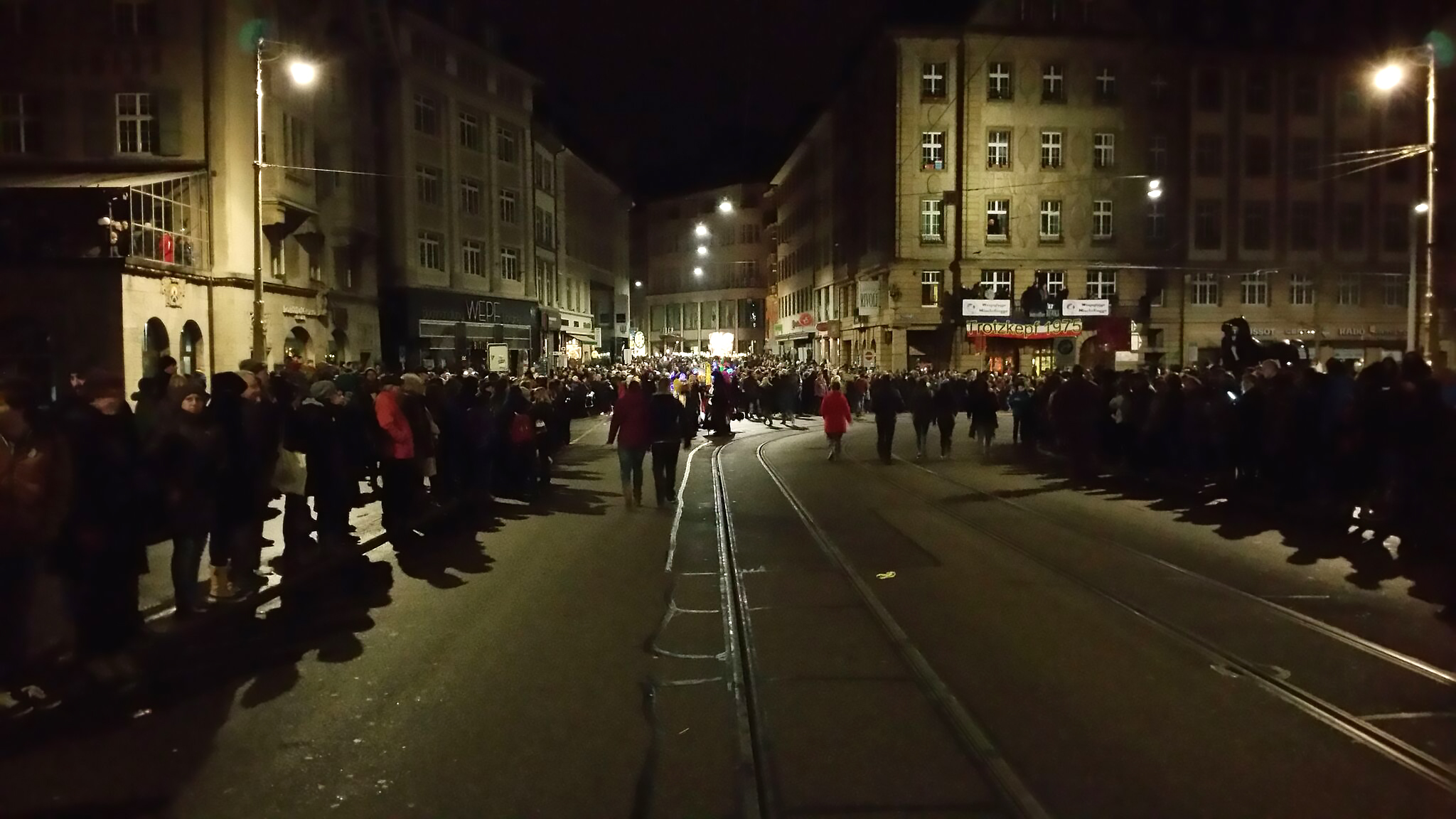 des festivités qui durent 72 heures d’affilée, à commencer par le morgenstreich (morgestraich en bâlois) qui débute le lundi à 4h du matin pétantes (précision suisse). les lumières de la vieille ville s’éteignent toutes d’un coup aux cris enthousiastes d’une foule nombreuse (jamais vu autant de monde dans les rues d’une ville si tôt le matin) et les cliques prennent alors le relai. les figurants (vorträbler) ouvrent la marche en portant des lanternes, soit sur leur tête (pour les petites), soit au bout de bâtons (pour les moyennes), soit à bout de bras (pour les grandes), au son de fifres et de tambours. au début, chacune des cliques est censée jouer le même air, mais rapidement les mélodies évoluent vers des morceaux semblant totalement libres.