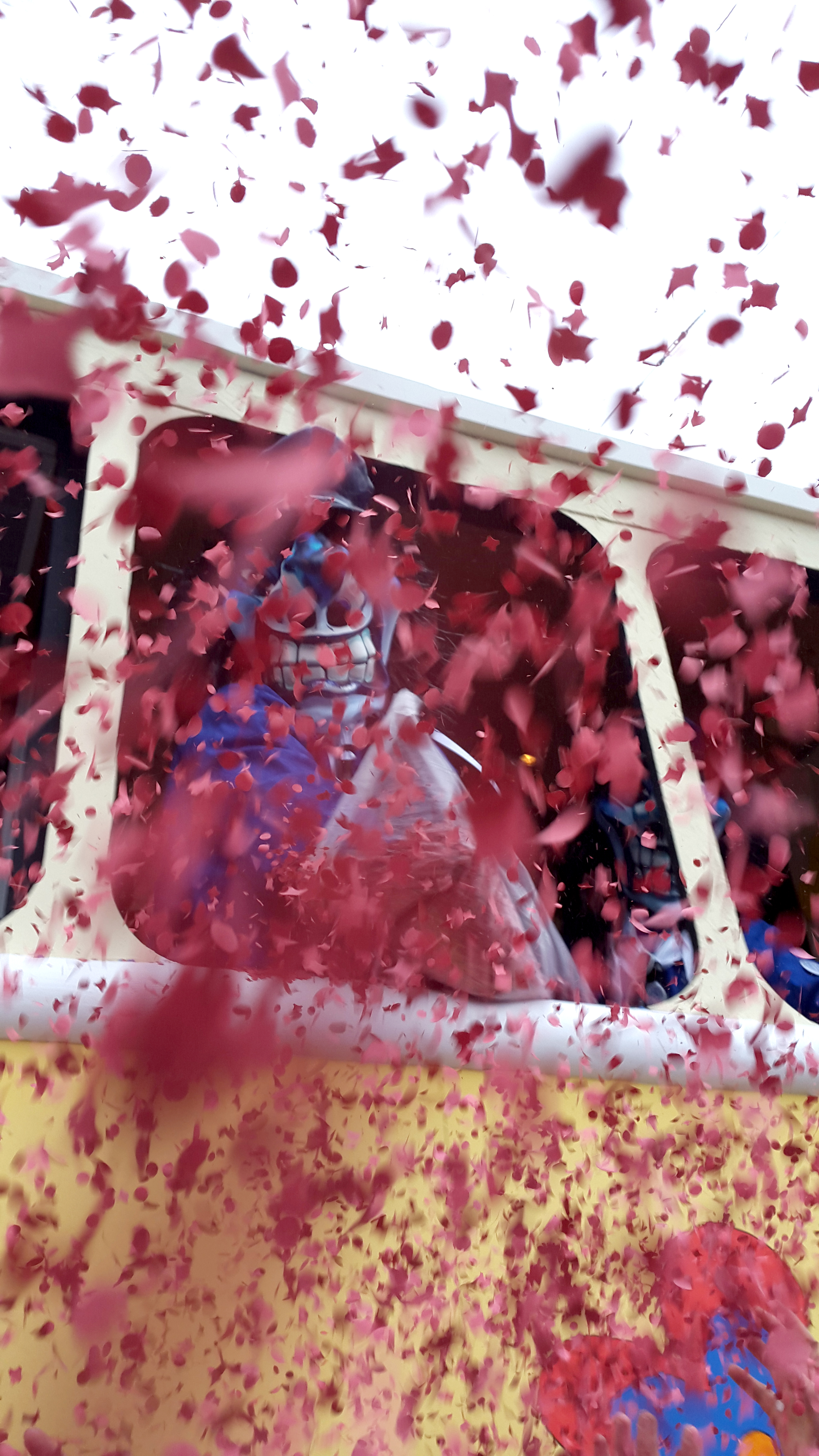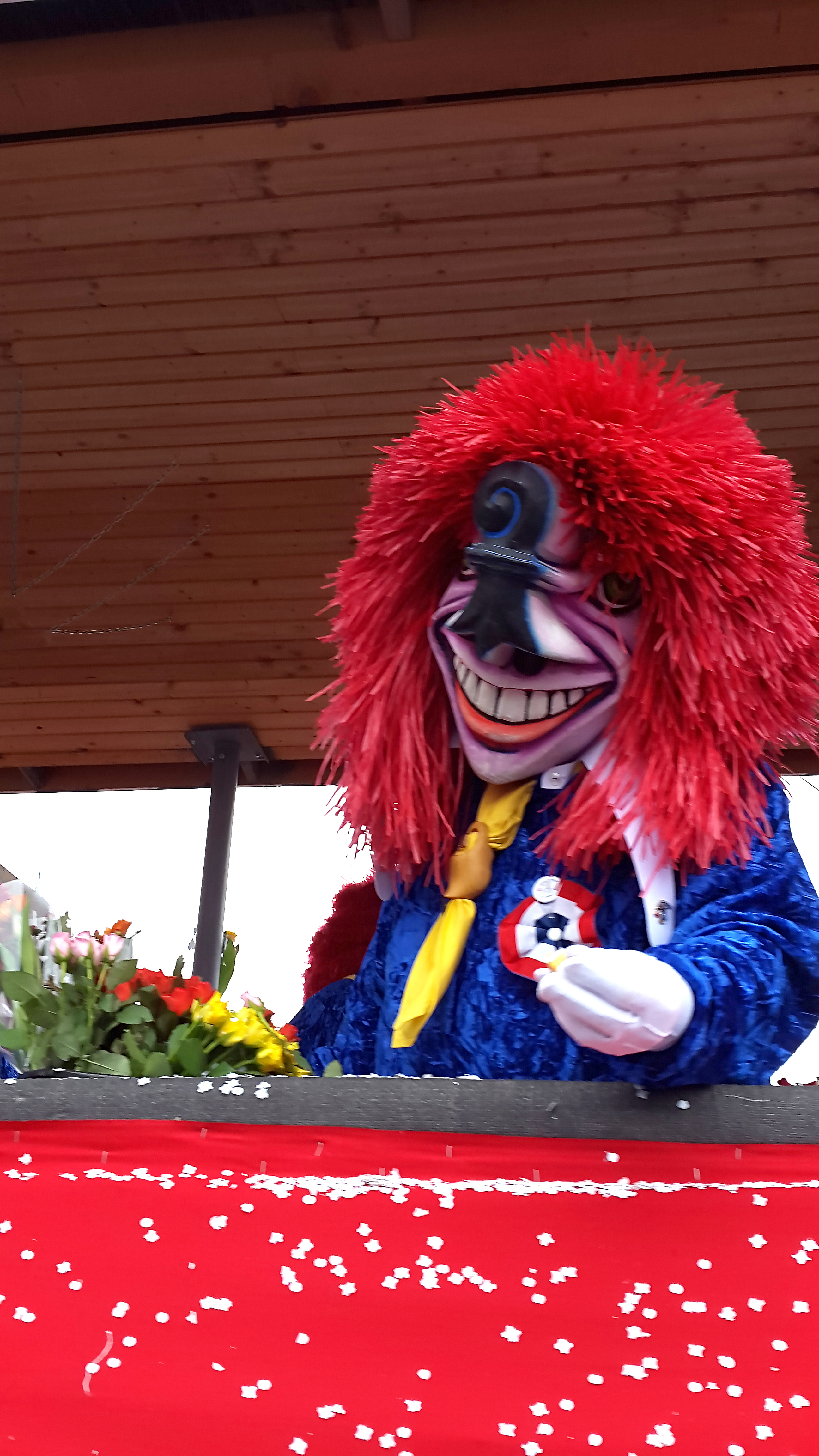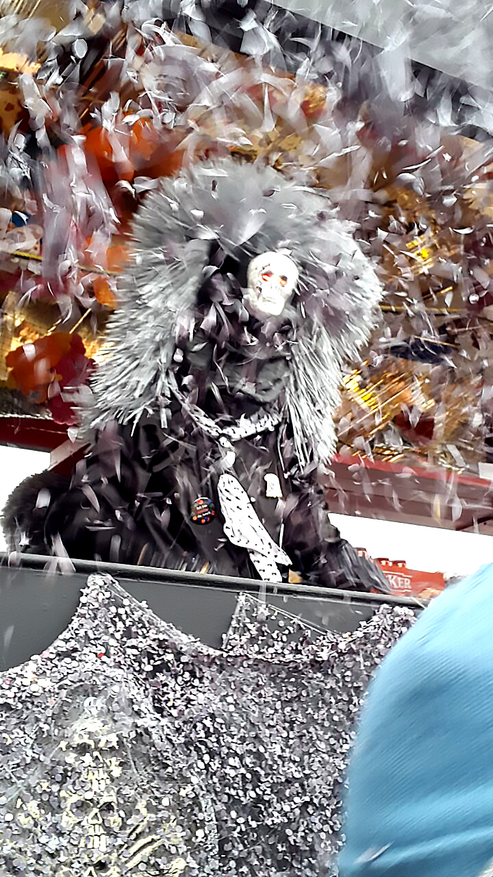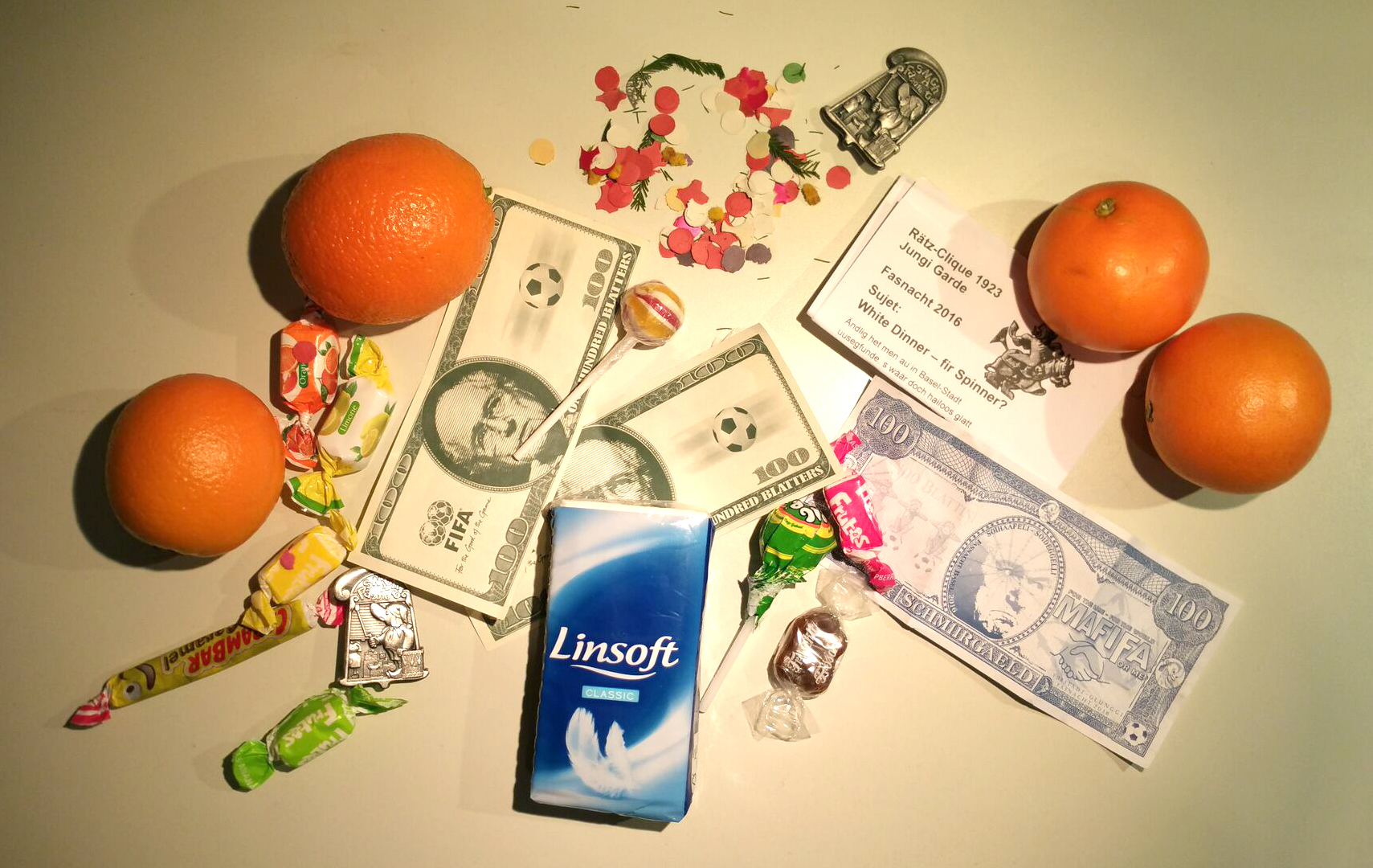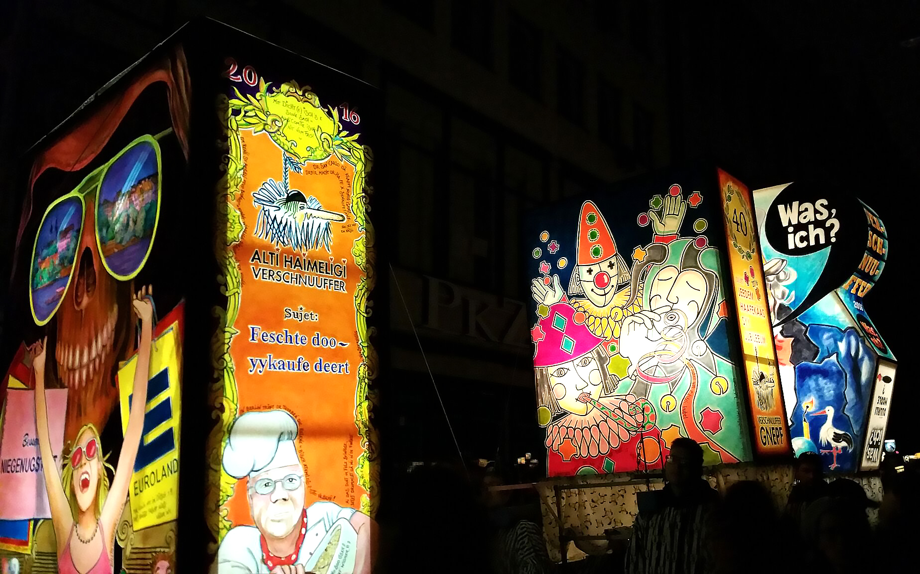 comme dans tous les carnavals, le fasnacht est l’occasion de revenir sur des événements de l’année écoulée, qu’ils soient politiques, économiques, sportifs, locaux, nationaux ou internationaux, et d’égratigner au passage des personnages qui les ont faits. chaque année, donc, un sujet domine. les années précédentes, c’étaient par exemple les travaux envahissants en ville ou les selfies. cette année, le thème général était « mer mache dicht » (« on met la clé sous la porte »), illustré sur la « plaquette » (pin’s servant de ticket d’entrée au carnaval et à des expos), dont l’acquisition (partout dans les rues) est facultative mais appréciée car le produit de sa vente permet de financer les différentes cliques, et dont il existe plusieurs versions à des prix différents (de chf 8.- en cuivre à chf 100.- en plaqué or). les sujets en découlant, très nombreux, étaient chacun adoptés et illustrés par chacune des cliques, d’abord au cours du morgenstreich, puis sur les chars des cortèges, les lundi et mercredi après-midi. parmi ces sujets, on a pu remarquer par exemple l’argent et la corruption (fifa, sepp blatter, platini, foot, la grèce), la mort des commerces en centre-ville, le trafic, le boire et le manger, la fusion bâle-ville/bâle-campagne. en tant que touriste ne parlant pas le bâlois, il était évidemment impossible de repérer et de comprendre tous les sujets. mais on a quand même pu apprécier des ghostbusters en costumes de serpillières, des clowns, des personnages de la guerre des étoiles, des jokers. on a même vu hollande, si j’ose dire.