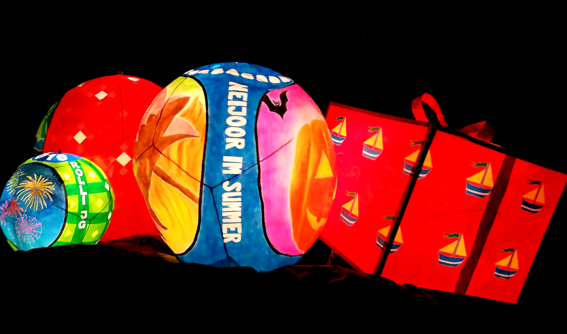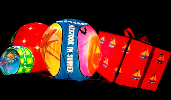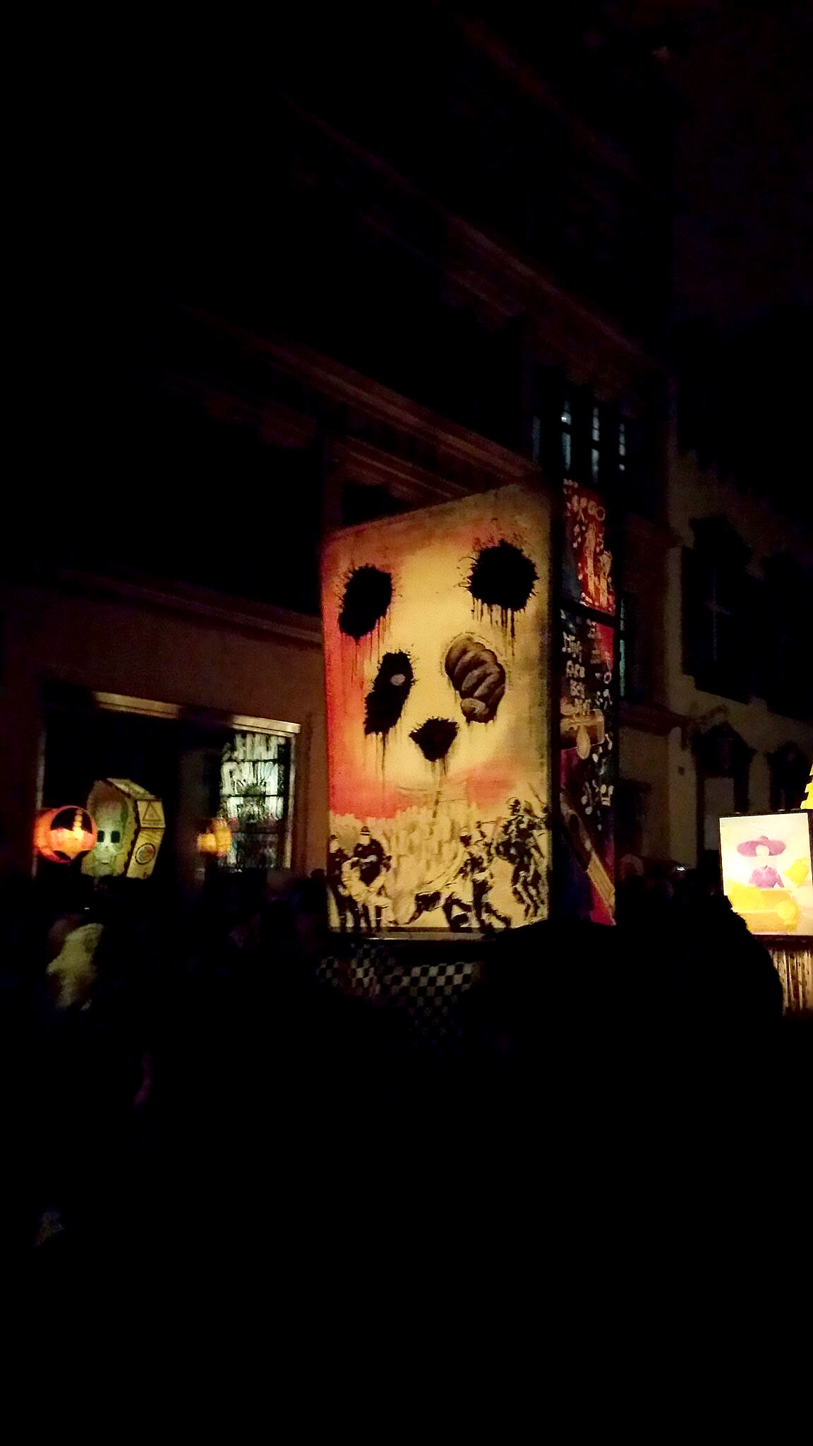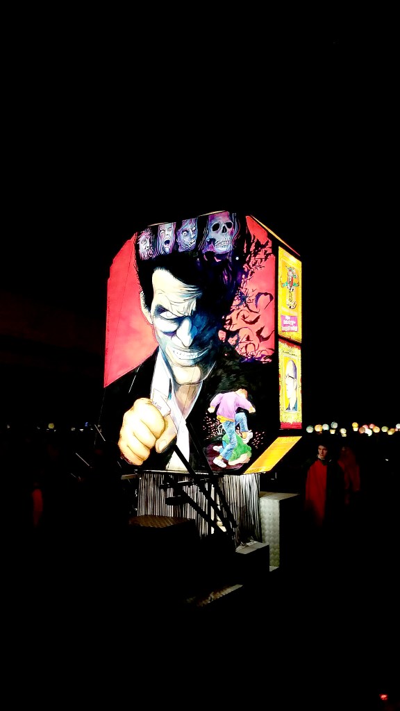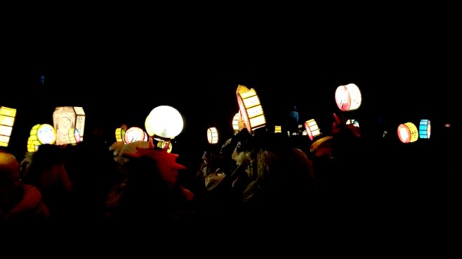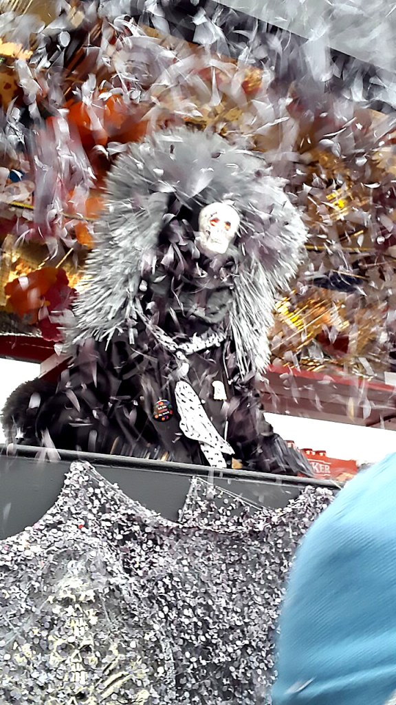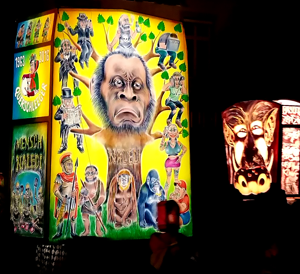 lanternes de taille moyenne, portée au bout de bâtons. comme dans tous les carnavals, la dimension satirique de la vie politico-sportivo-financiairo-économique locale (avec des digressions vers l’international tout de même) échappe totalement au touriste moyen que nous étions en l’occurrence. un peu comme une revue genevoise le serait pour tout outsider digne de ce nom. cela dit, nous fûmes (oui, un passé simple de temps en temps) tout de même émerveillés par les couleurs, la créativité et la richesse des costumes, l’ignorance n’empêchant nullement l’appréciation.