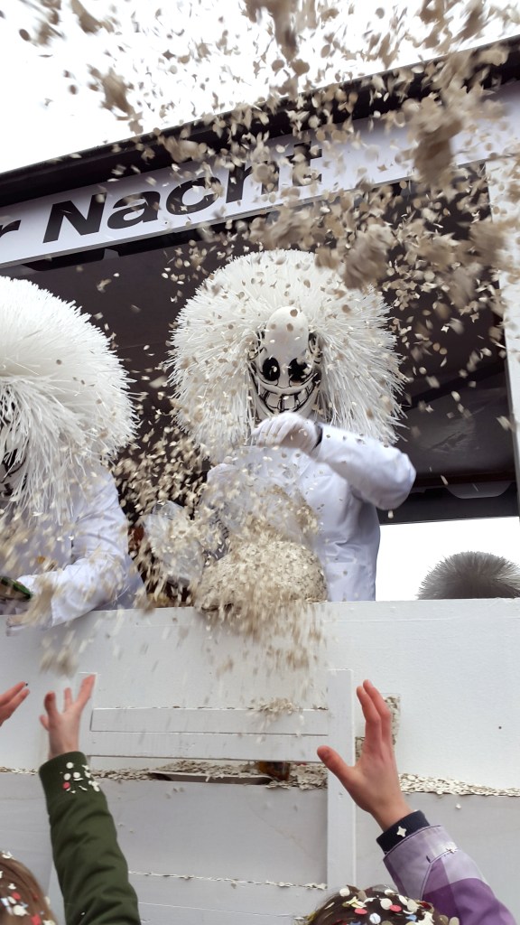 le carnaval de bâle, cela faisait un bon bout de temps que nos cops nous gratifiaient de toutes sortes de réactions. émerveillées: c’est magique! ah c’est quelque chose! il faut voir ça au moins une fois dans sa vie! on n’en loupe pas un! blonds façon gad: ah ouais, t’y es pas encore allé?! tragicomiques: couuuuuuaahhhhh?!?!?!? vous n’y êtes pas encore allés (très importante, la ponctuation)!?!?!?!?!? mi-envieuses mi-désespérées: ha, bande de ienchs, ça fait des années que je veux y aller, vous me raconterez, hein, hein?? pleeeeaaaase!!!!