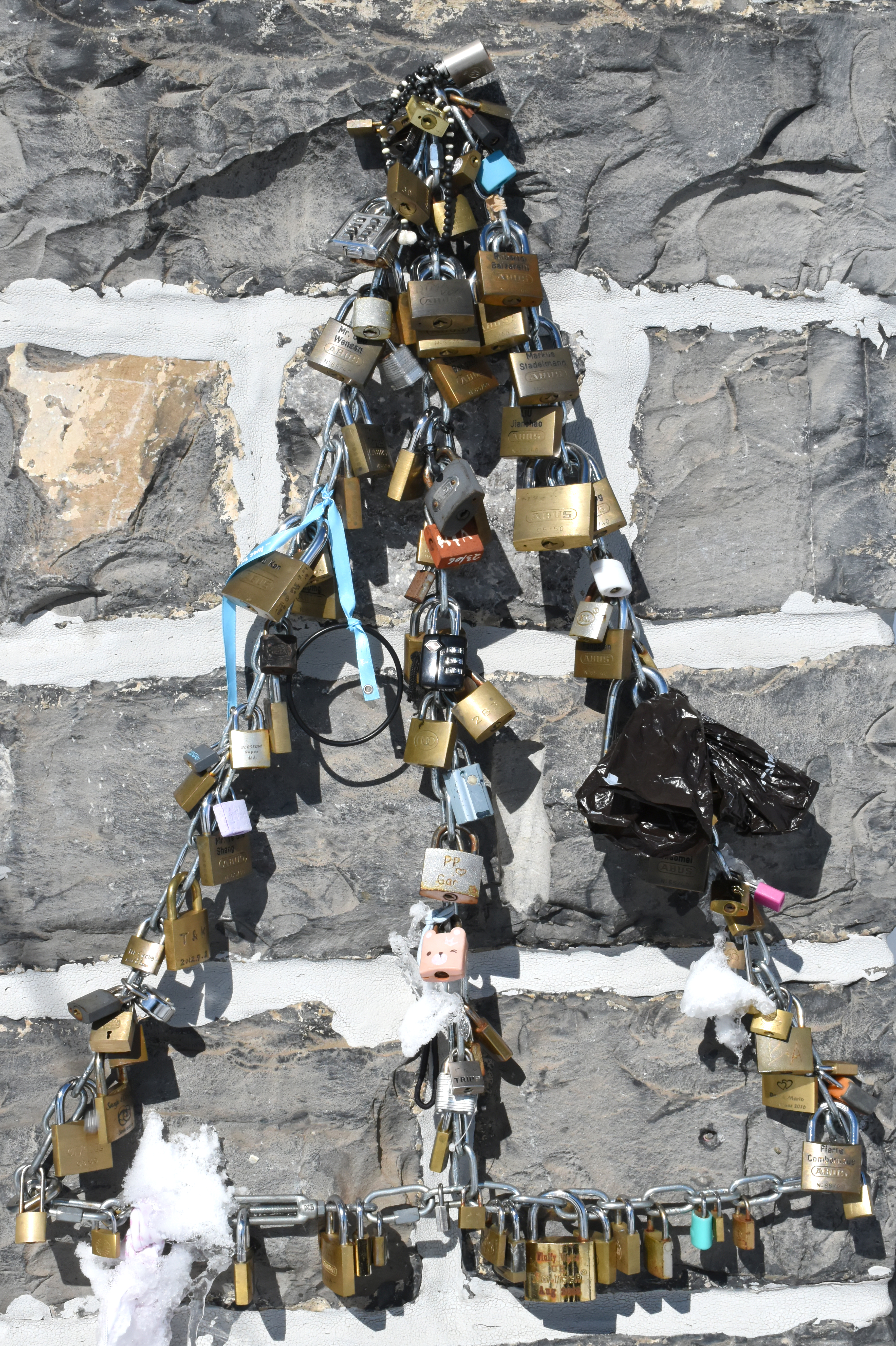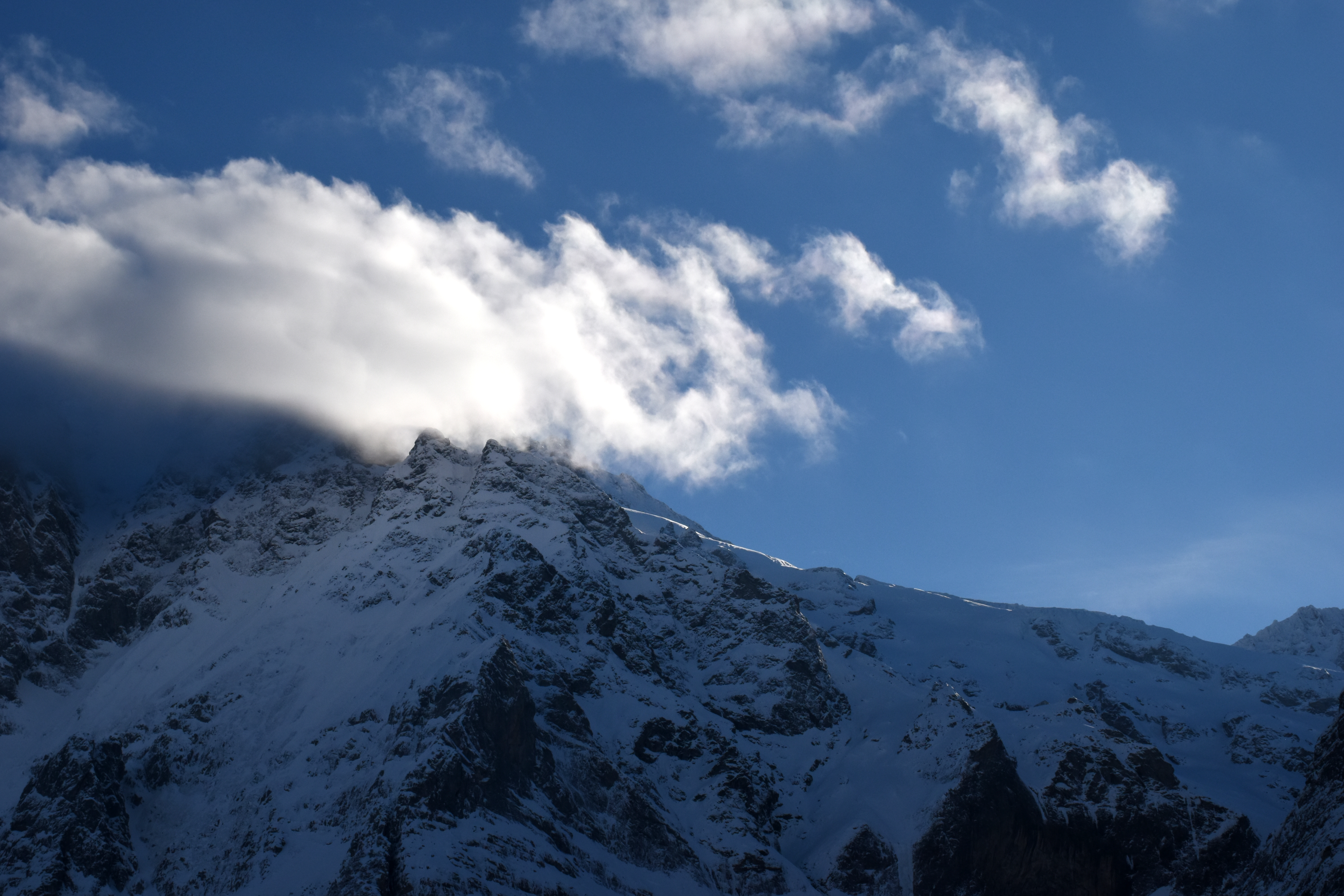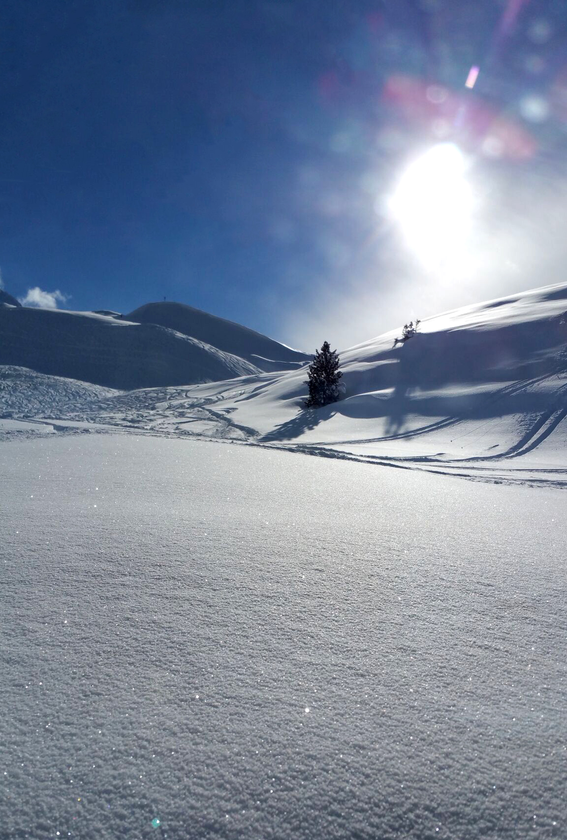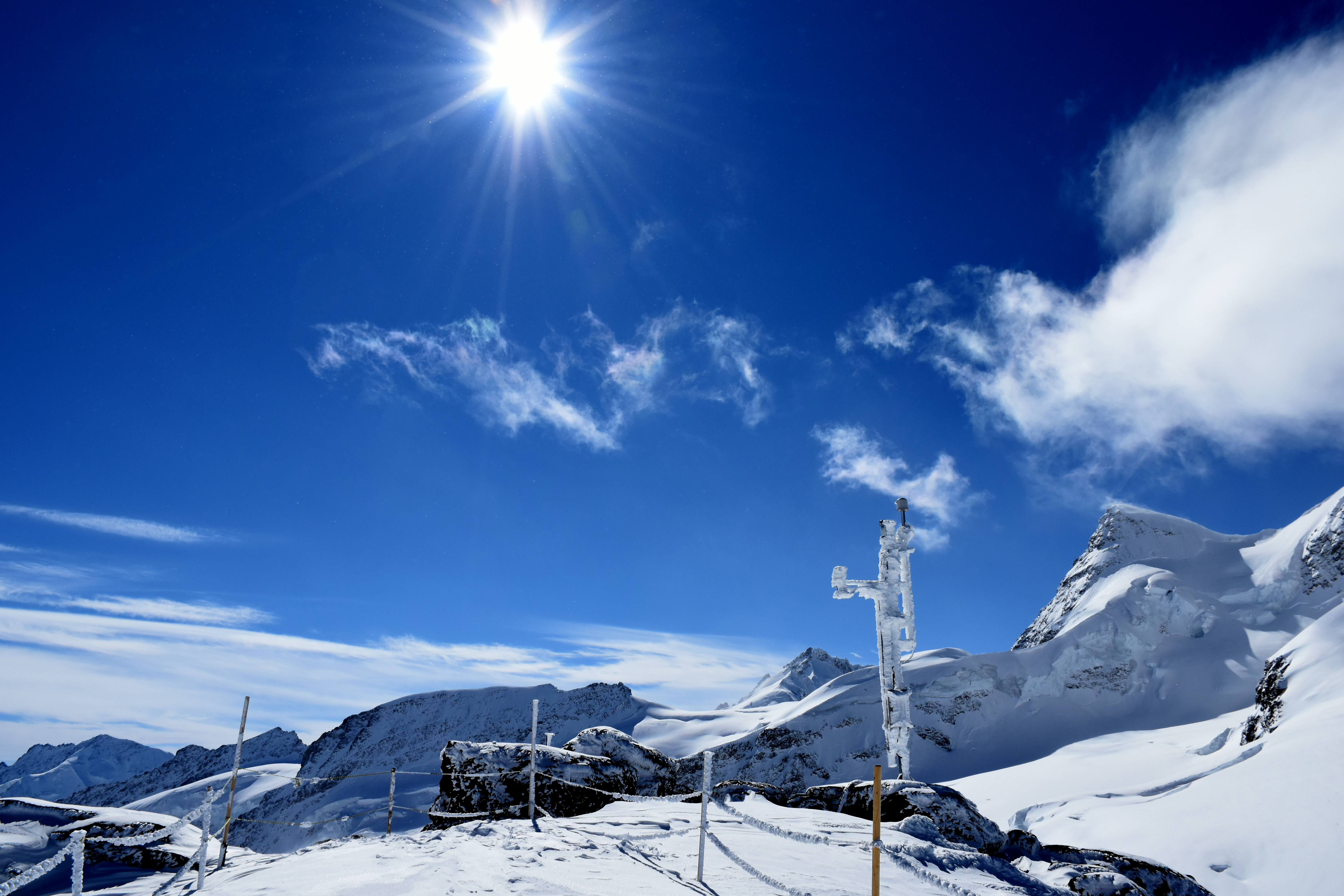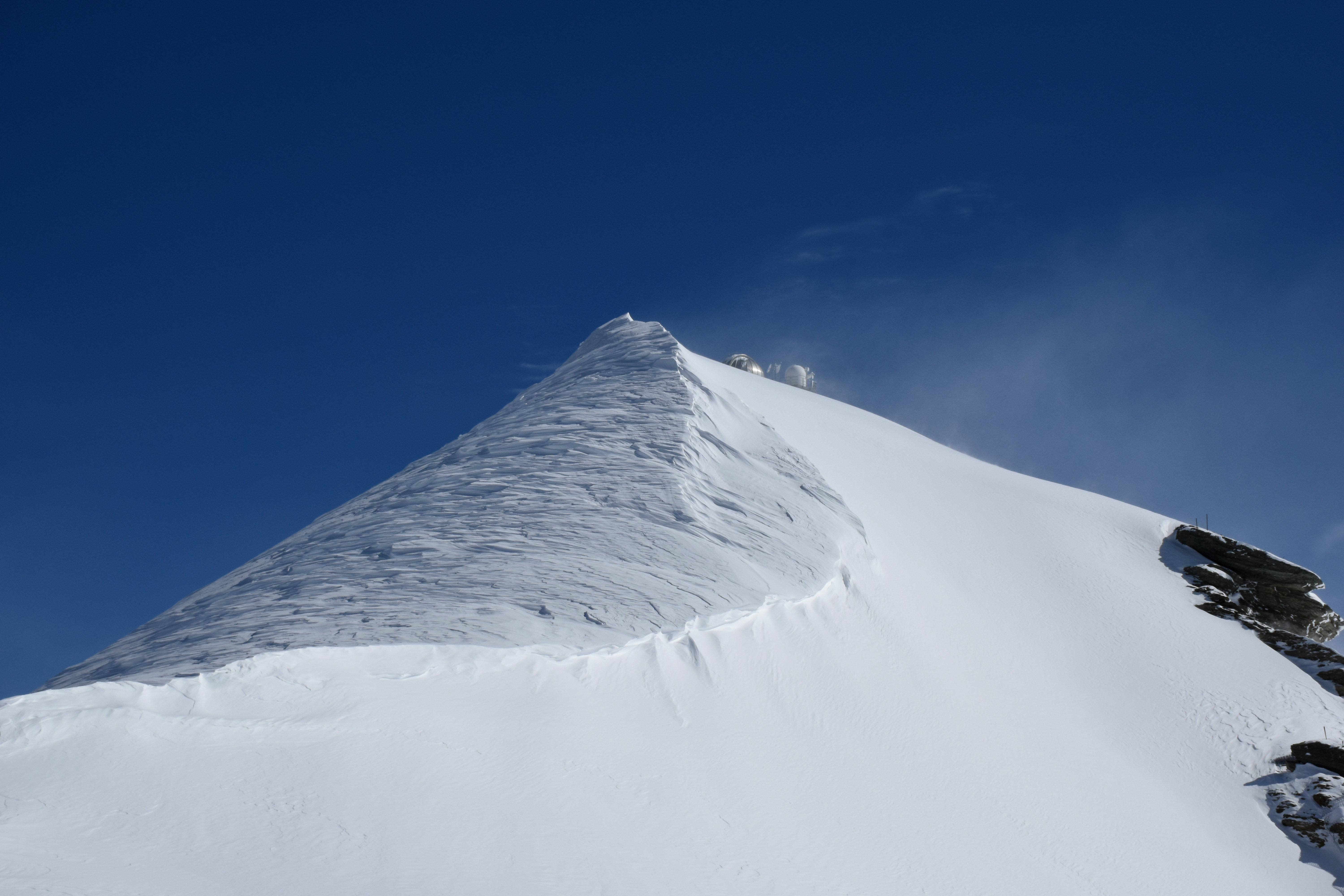 depuis la gare, on peut sortir sur une plate-forme battue par les vents pour admirer le paysage. arrivant à hauteur des genous, la poudreuse rend la progression difficile…