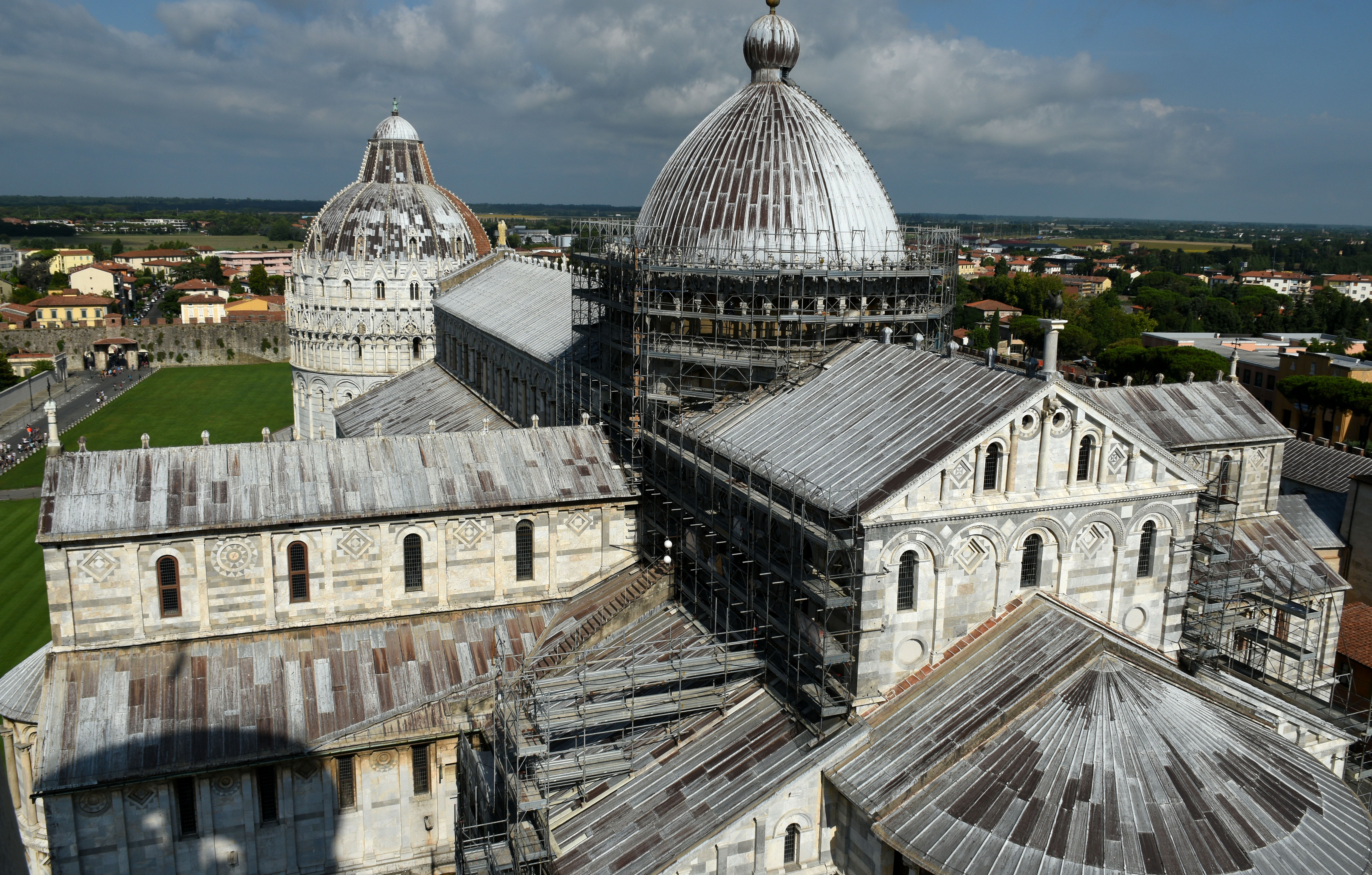 il faut bien se représenter la chose: la place des miracles est composée, à l’est, du campanile bien sûr, mais aussi, juste derrière, du museo dell’opera del duomo, du duomo proprement dit (cathédrale), que l’on voit ici au premier plan, du battistero di san giovanni, à l’ouest (ici au second plan), du camposanto, cimetière monumental, au nord, et du museo delle sinopie (esquisses), au sud. plus loin à l’est, le palais de l’archevêché ne fait pas partie de cet ensemble que constitue la place.
