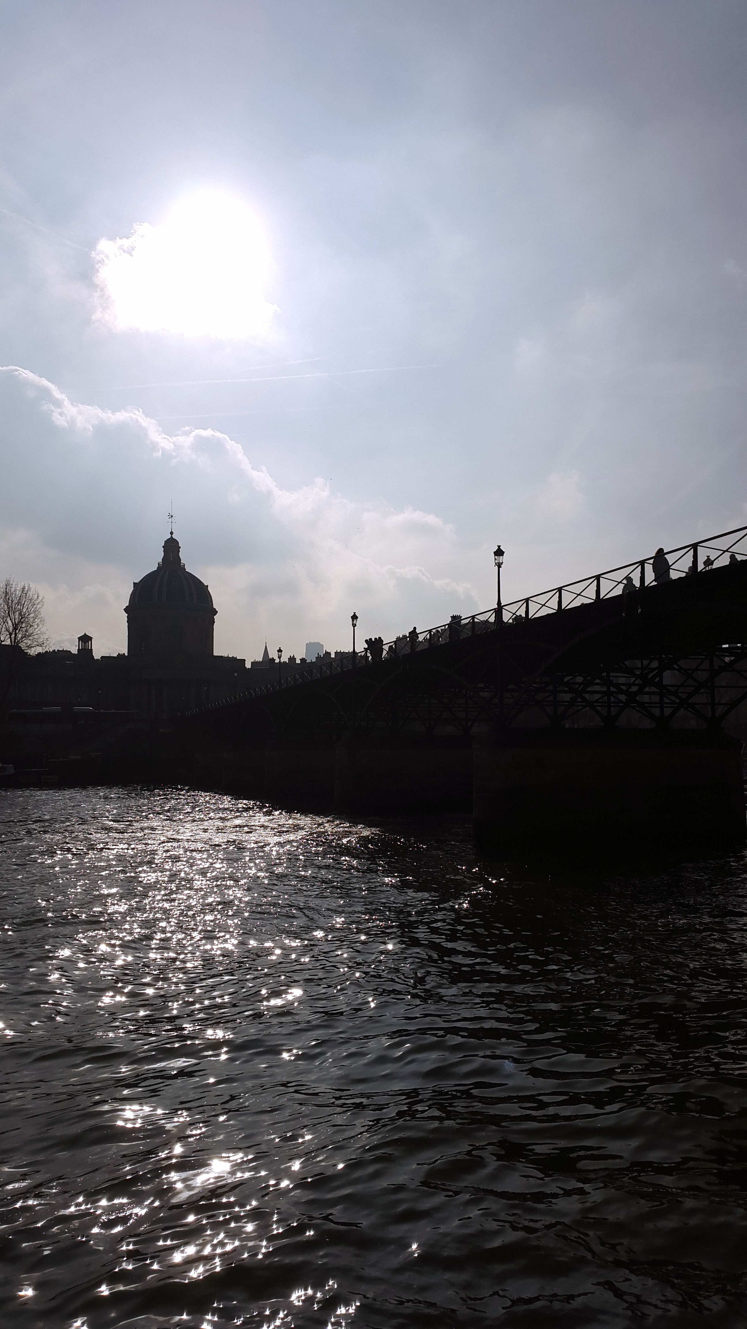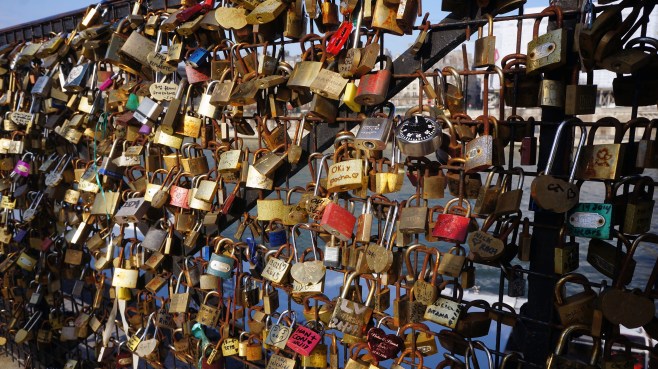 le pont des arts dont les grilles trop chargées de cadenas (et devenues dangereuses) ont été remplacées par des plaques en plexiglas.