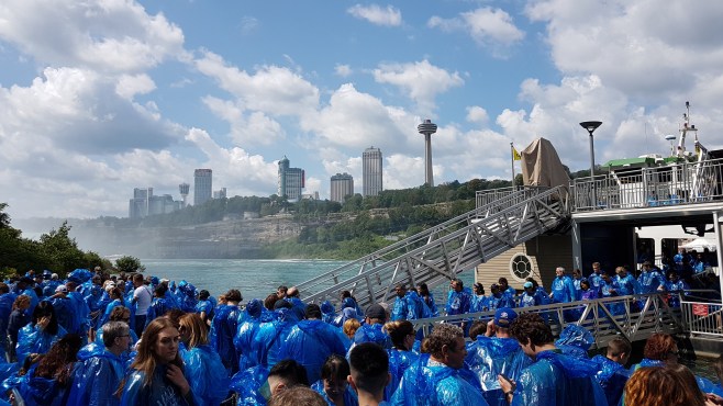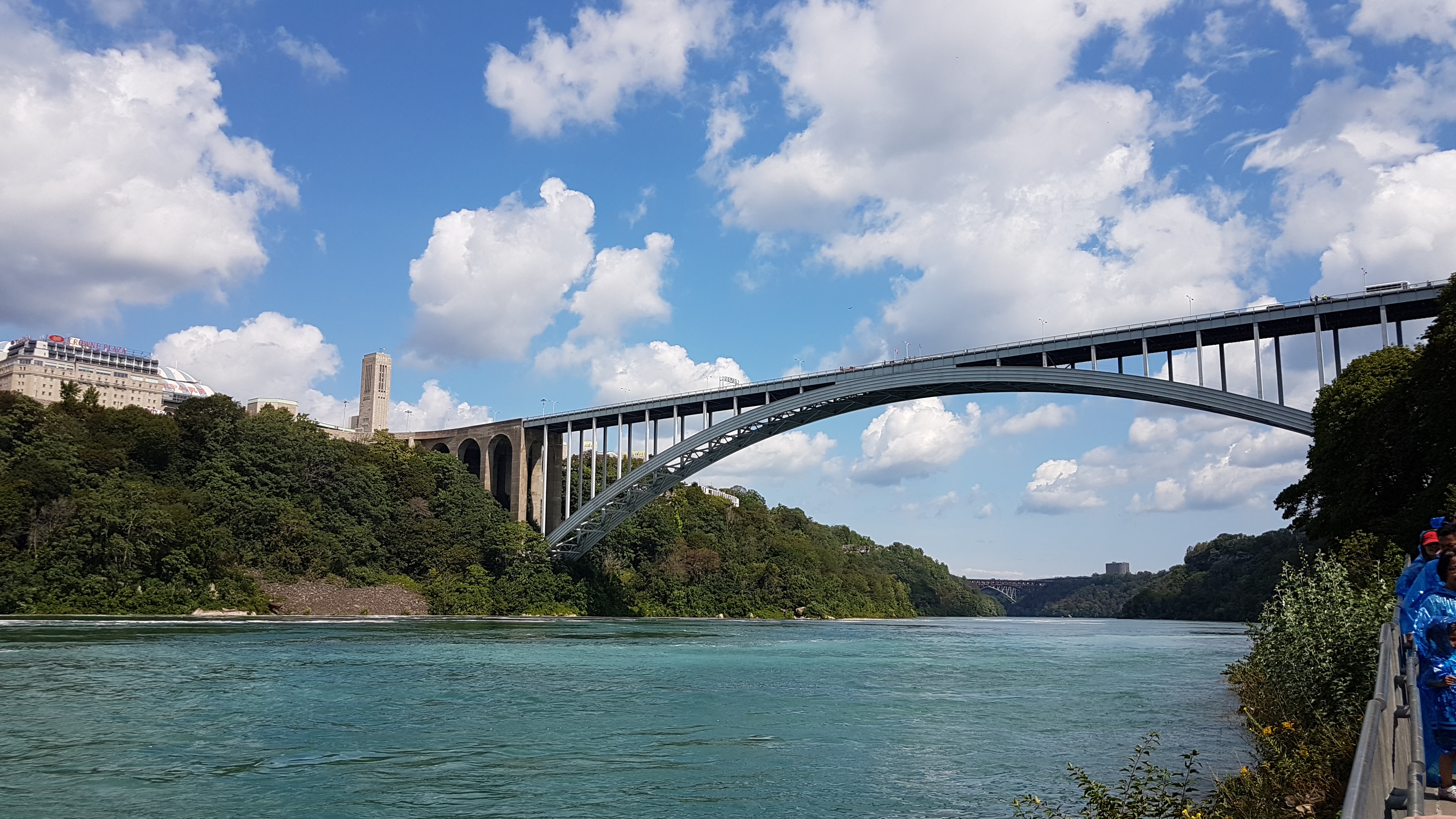 les chutes se voient d’en bas depuis un petit bateau baptisé maid of the mist que l’on prend après avoir emprunté un ascenseur se trouvant dans la prospect park observation tower. d’en haut, on peut aussi les voir depuis le rainbow bridge, qui marque la frontière entre les états-unis et le canada (une plaque symbolise la séparation), et bien sûr côté canadien. tout est aménagé des deux côtés pour qu’on n’en perde pas une miette.